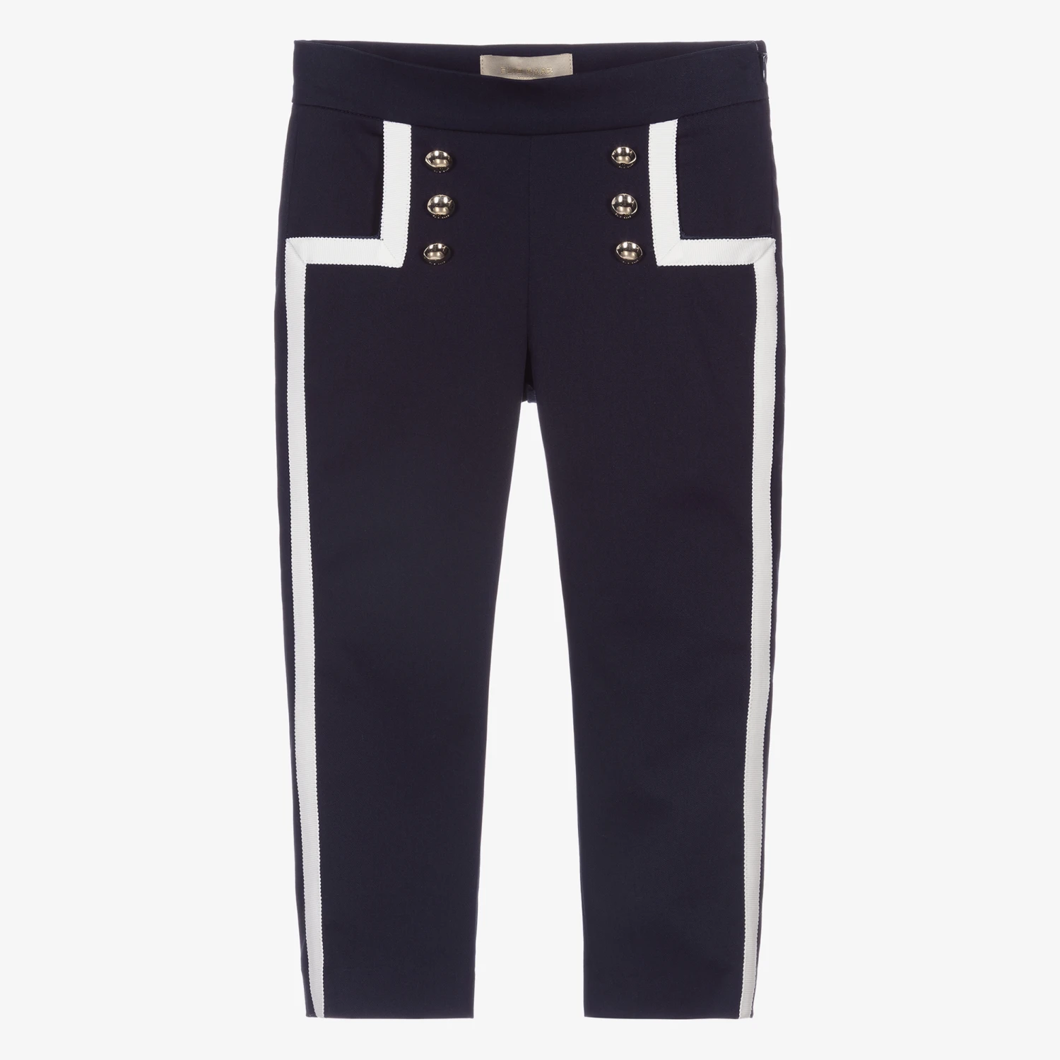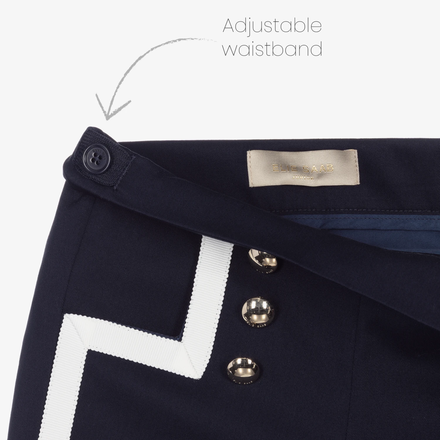 Fabulous smart casual trousers for girls by Elie Saab, made in navy blue cotton twill. They have white grosgrain trims around the front pockets and down the seams, with decorative shiny gold logo buttons below the adjustable waistband.