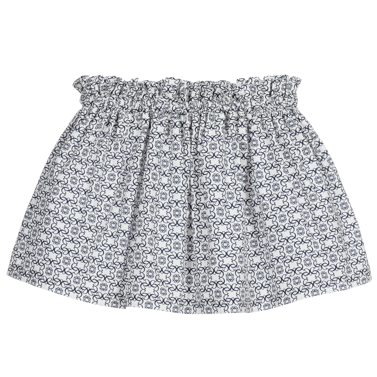 White skirt for girls by luxury brand Elie Saab, made in soft, lightweight cotton, with a navy blue monogram logo print. Lined in soft cotton, it has additional tulle layers to give added volume and a comfortable elasticated waistband.