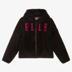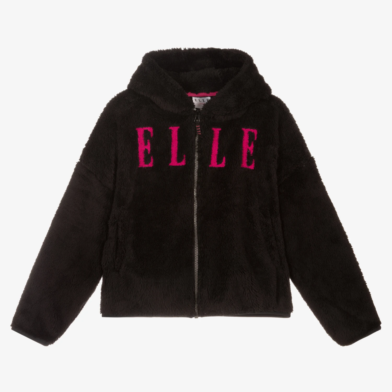 Black zip-up hooded top for girls from Elle, made in super soft faux fur. It has a bright pink bouclé logo, branded zip fastener and front pockets.