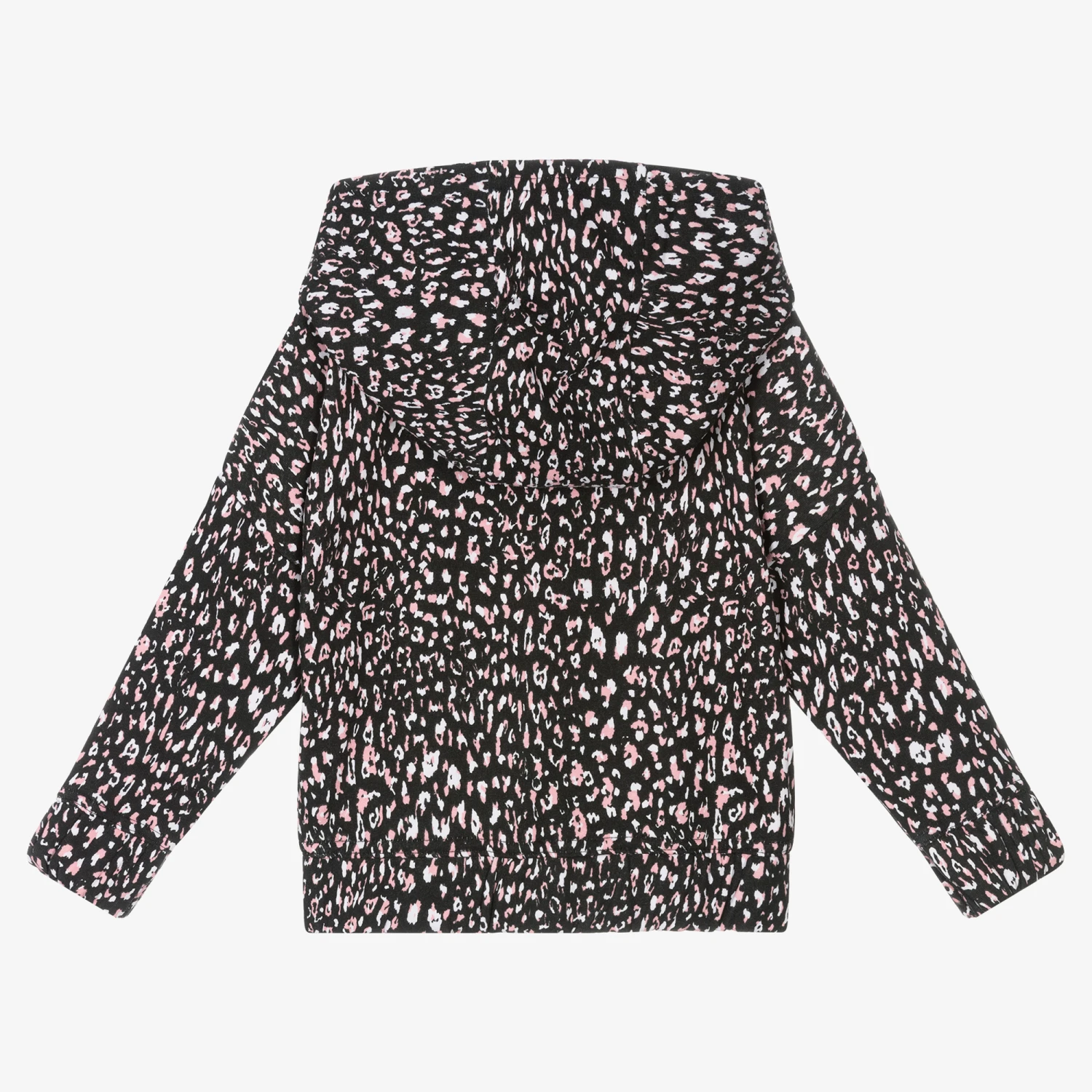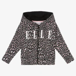 Girls hooded zip-up top from Elle, in black, pink and white leopard print with a white logo across the front. It is made in soft cotton-blend sweatshirt jersey with a cosy brushed feel inside and has elasticated cuffs and hem.