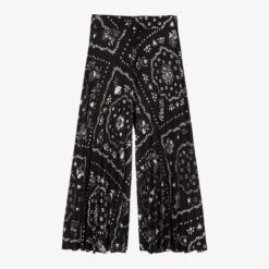 Girls stylish black palazzo trousers by Elsy, with a white bandana-style print. Lightweight and elegantly pleated, these wide leg trousers have an elasticated waistband, and pretty beaded detail on the drawstring tie.