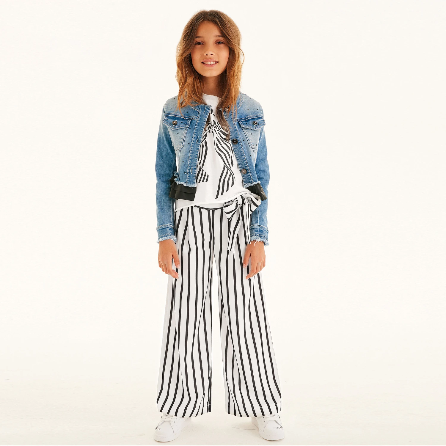 White and black striped culottes for girls by Elsy. These stylish trousers are made in soft crêpe with an elasticated back waistband and a matching, detachable tie belt.