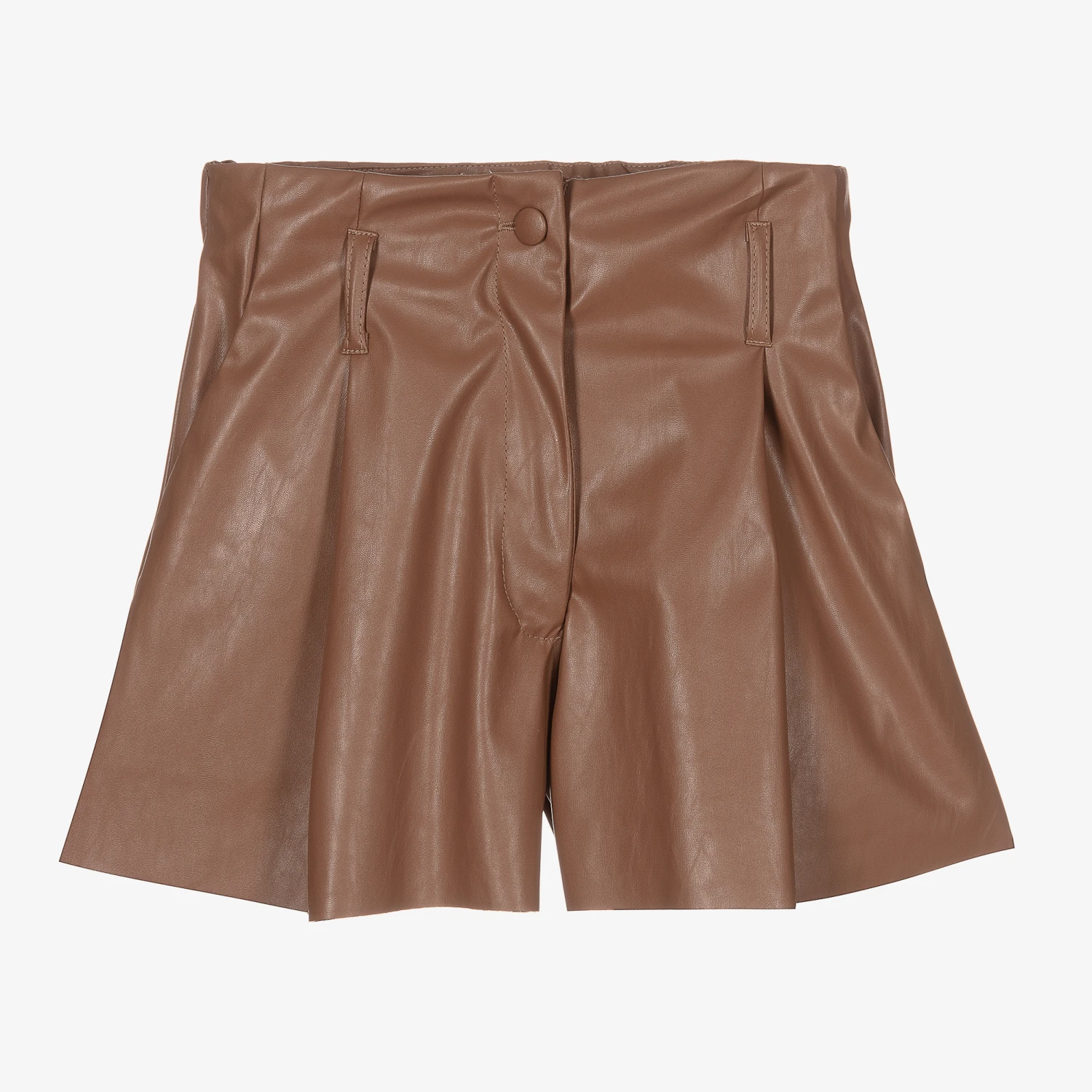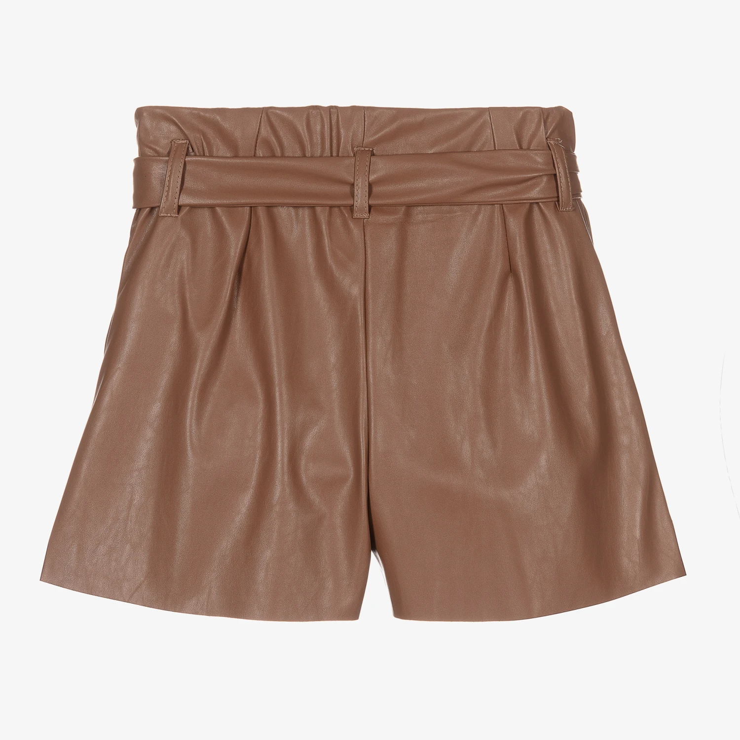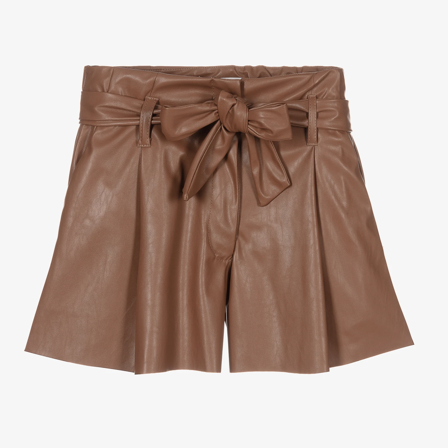 Brown shorts for girls by Italian designer Elsy, made in lightweight faux leather. They are pleated on the front and have a removable sash belt that ties in a bow. They fasten with a button and zip and have useful side pockets.