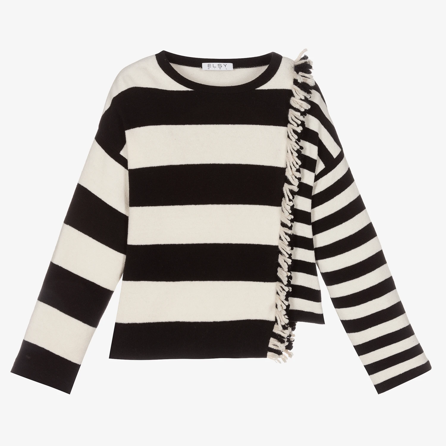Ivory and black striped sweater for girls by Italian designer Elsy. Knitted in a super soft cotton blend, it has fringe detailing and a shorter insert on one side, with narrower stripes.