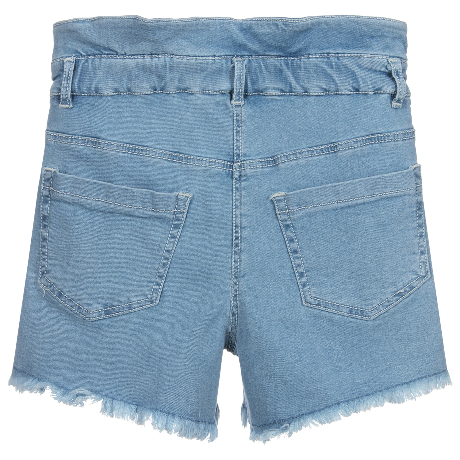 Blue washed cotton denim shorts for older girls from Elsy. Styled with five-pockets and frayed edges, they have a lovely, adjustable paper bag waist and sparkly diamanté studs.