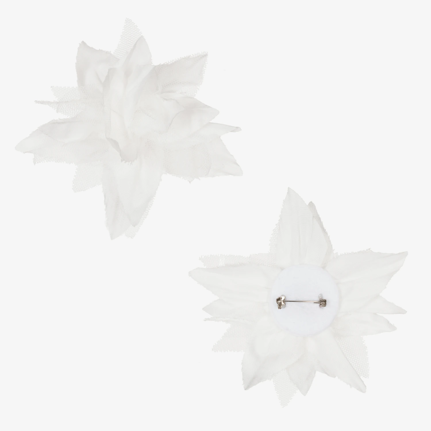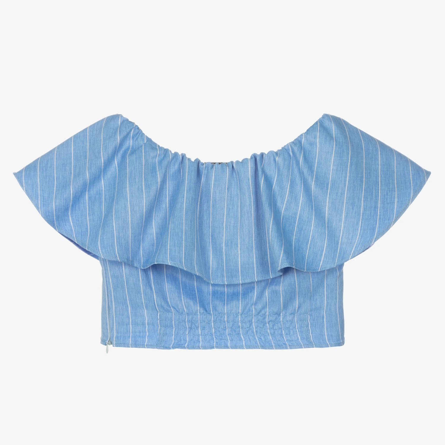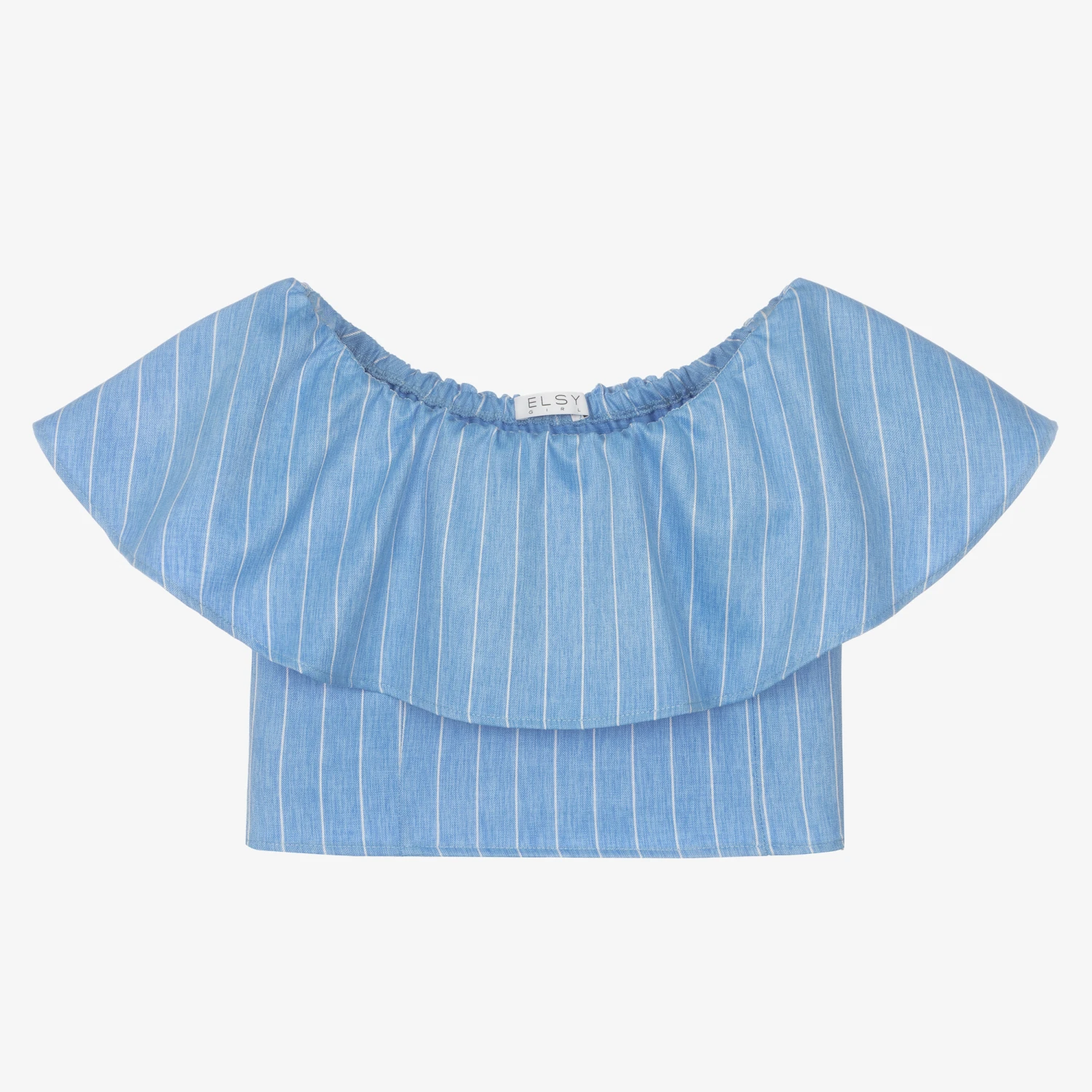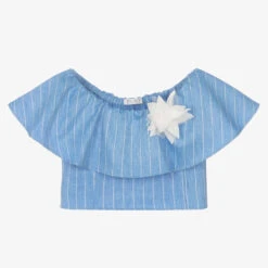 Lovely blue striped bardot blouse for girls, by Elsy. With a soft ruffle across the front, this relaxed summery top has a shirred panel at the back to hold a feminine, pretty shape. It comes with a delicate white tulle floral brooch to accessorize the look.