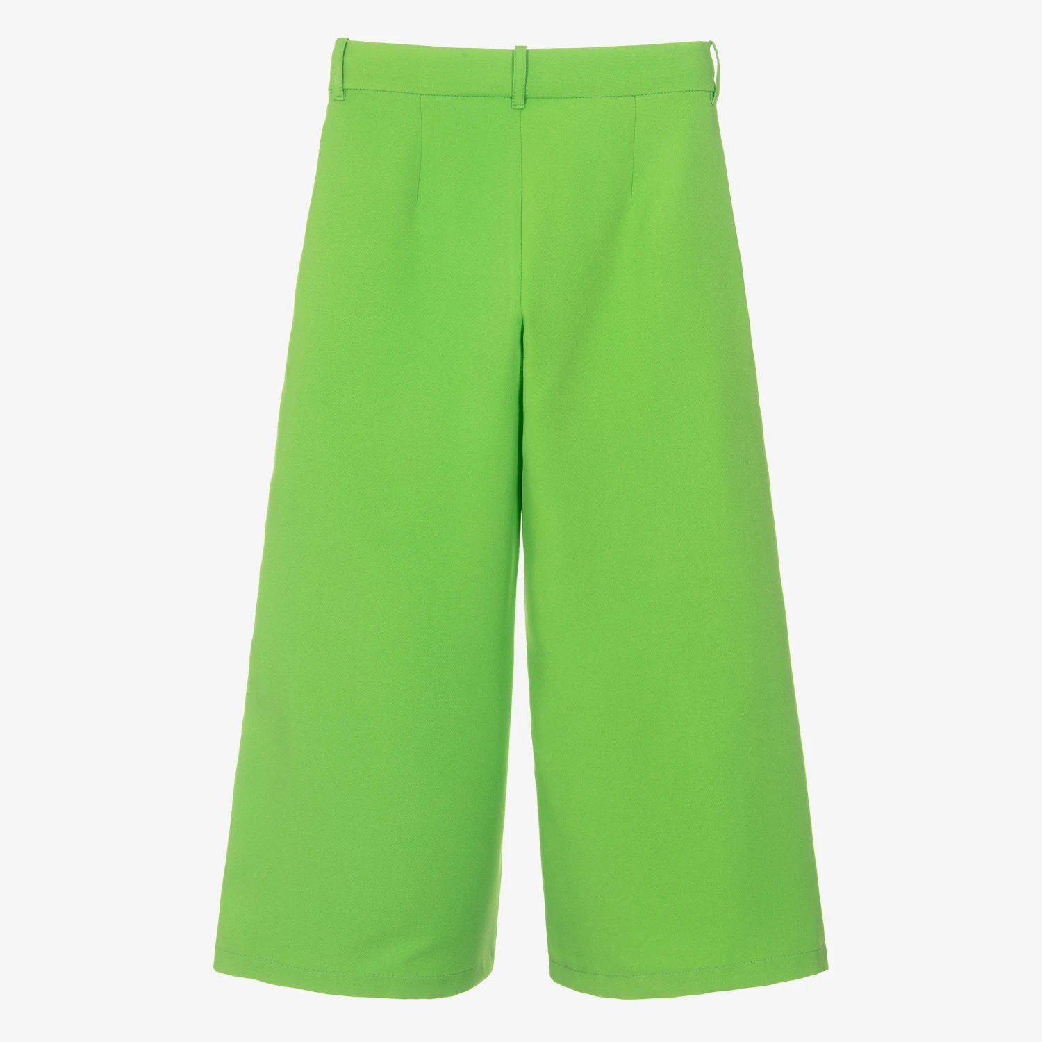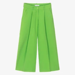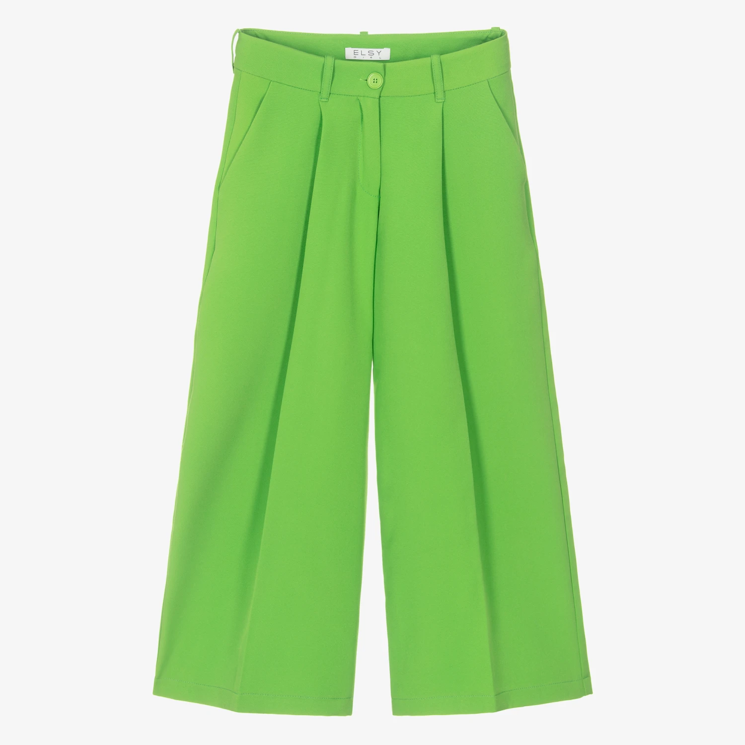 Stylish wide leg trousers for girls by Elsy, in a striking shade of green. Made in luxuriously soft crêpe, they have pleats on the front for a smart-casual look. They fastens with a button and zip fastening on the front, and have a useful adjustable waist for a flattering fit.