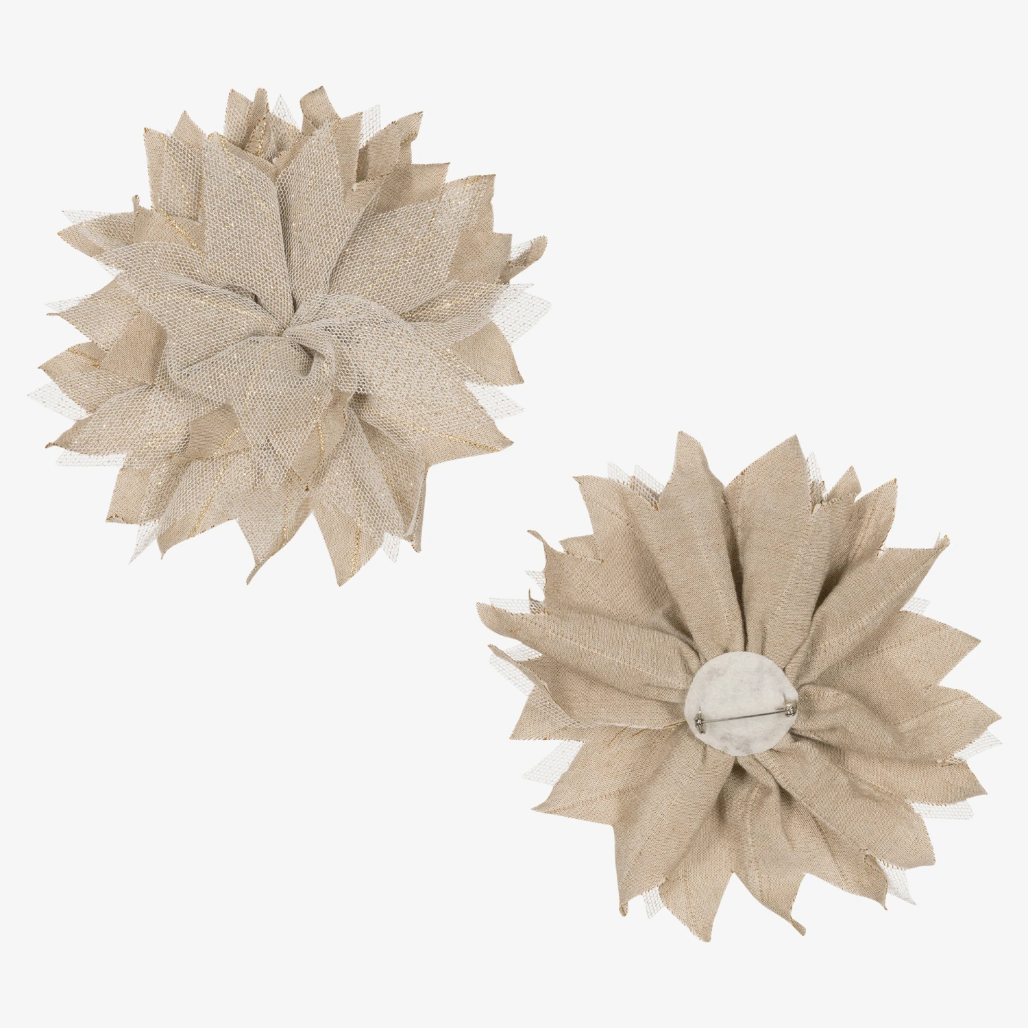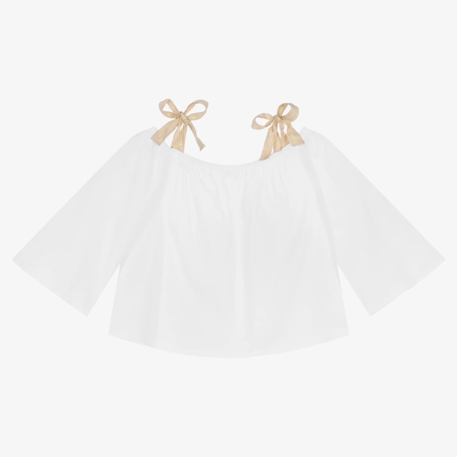Stylish white cotton blouse for girls by Italian designer Elsy, with beige shoulder straps glittering with gold thread. Made in lightweight, gathered poplin, it has pretty angel wings and an elasticated neckline, which can be worn off the shoulders. It comes with a beige floral brooch, with white tulle layers and sparkly gold detailing.