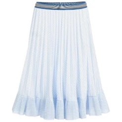 A lovely pleated skirt for girls by Elsy, in white with pale blue stripes. It is made in a lightweight polycotton blend with a sparkly blue and silver elasticated waistband, and finely pleated hem. This elegant skirt is comfortably lined in lightweight cotton.