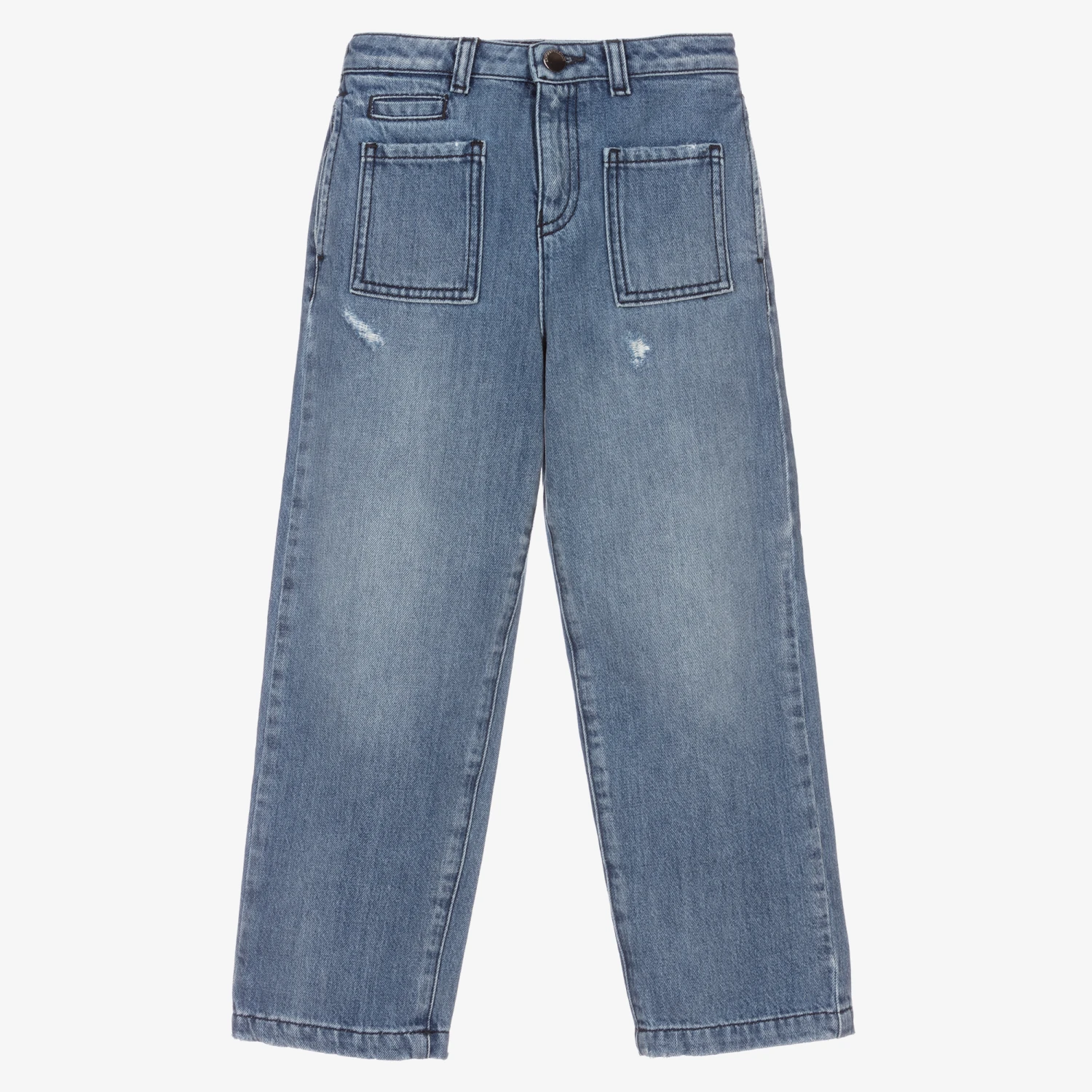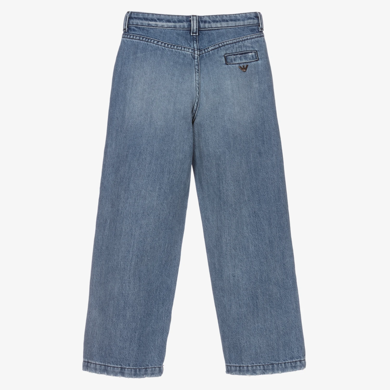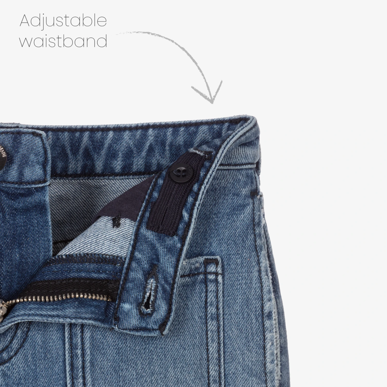 Girls washed blue jeans by Emporio Armani, made in soft cotton denim. Styled in a straight, relaxed fit, they have distressed details, pockets on the front and side seams with a silver tone Eagle logo badge on the back pocket. Stylish and comfortable, they have a front zip and button fastening, with a useful adjustable waist.