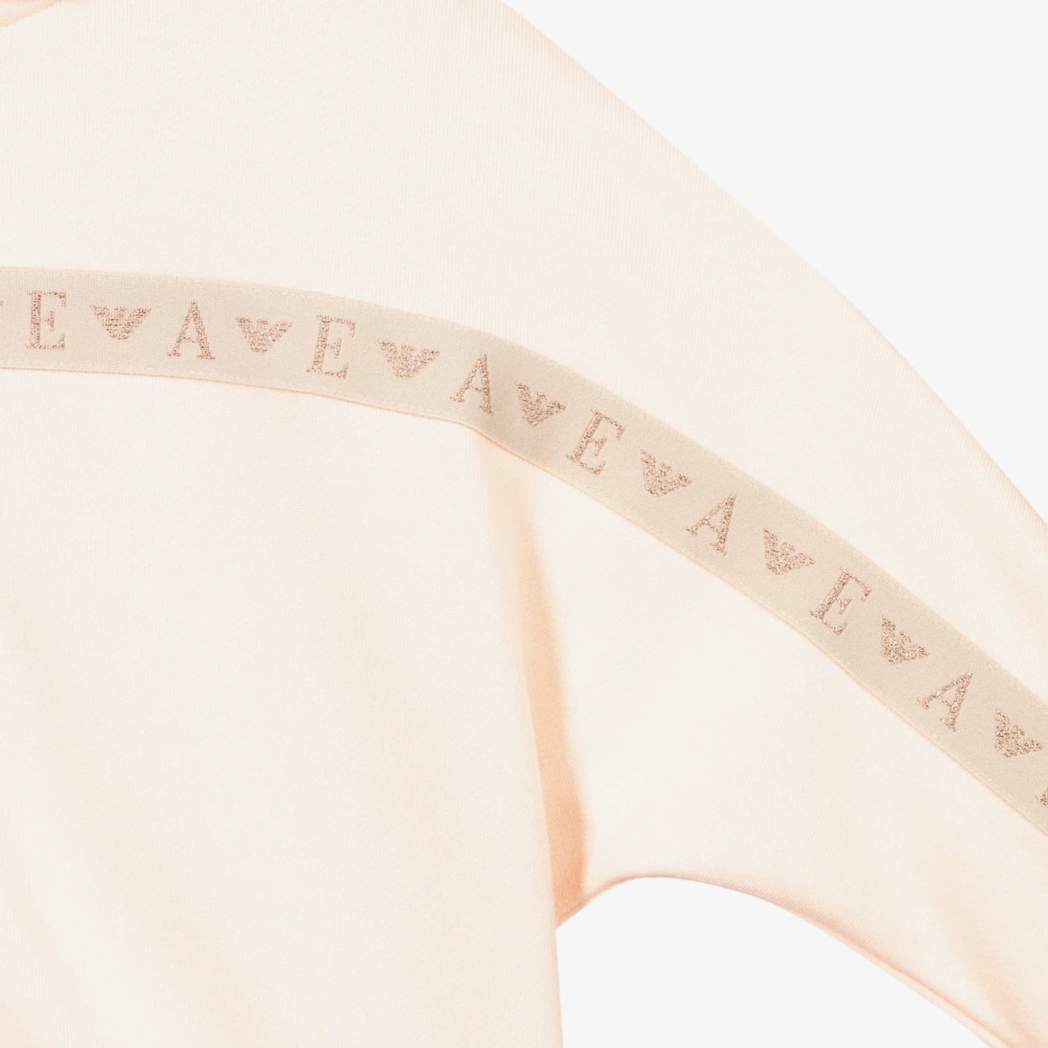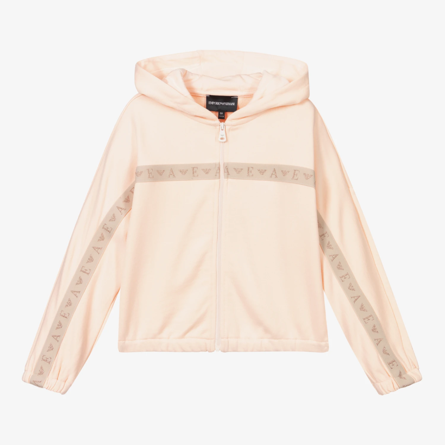 Pink hooded zip-up top for girls by Emporio Armani, in a batwing style with elasticated trims. It is made in soft cotton sweatshirt jersey, with beige and rose gold logo tape across the chest and sleeves.