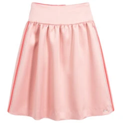 A beautiful, light pink polyester satin skirt for girls, with coral pink satin stripes on the sides, by Emporio Armani. It has a matching coral pink lining with soft gathers from the wide waistband, and a silver metal eagle logo badge near the hem.