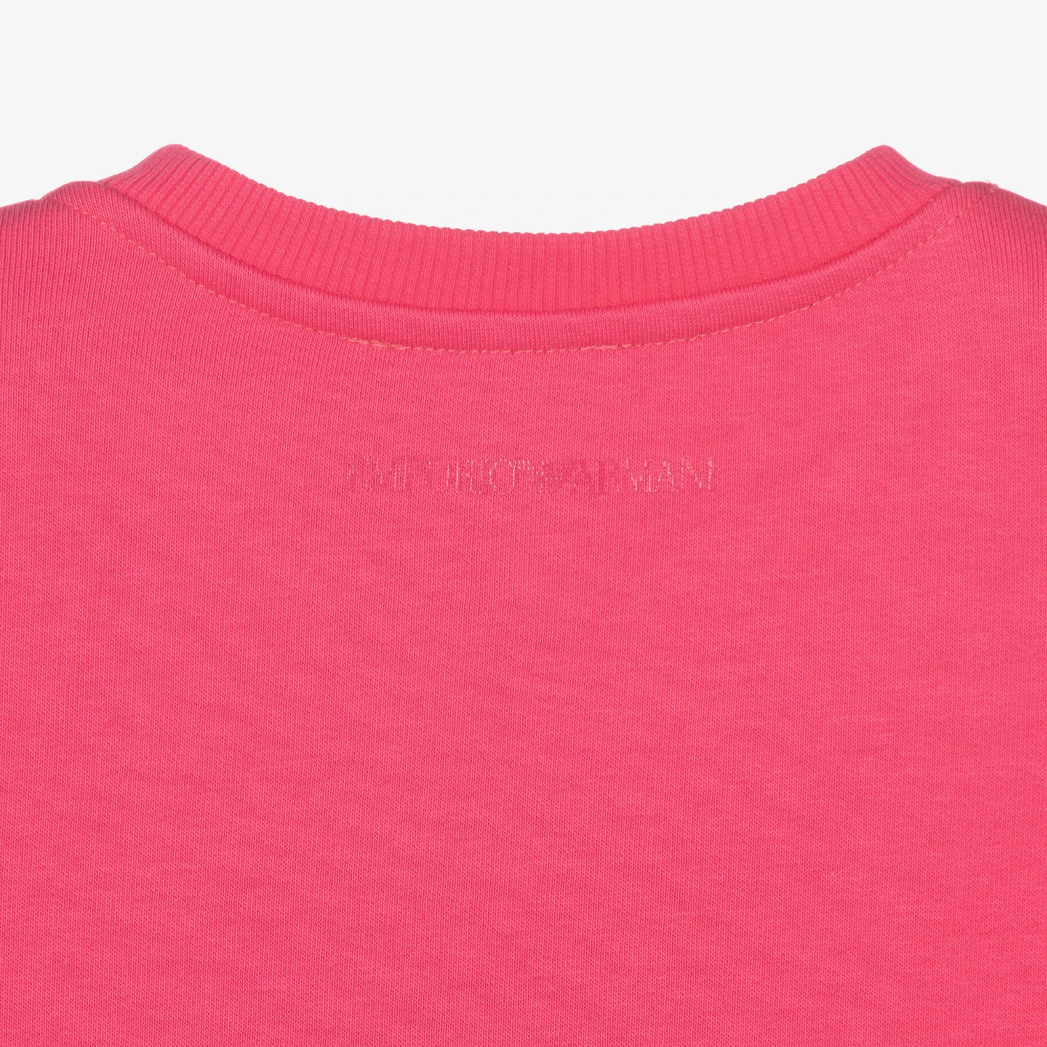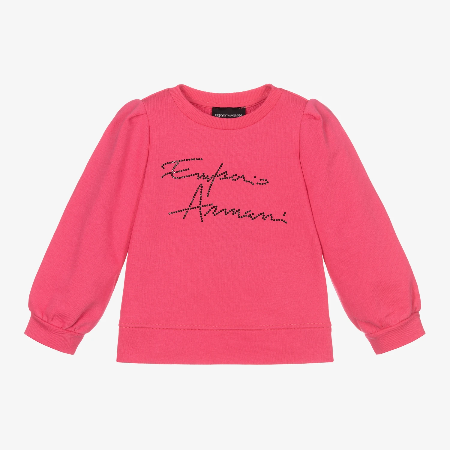 Girls pink sweatshirt from Emporio Armani, with a shiny black studded logo on the front. Made in lightweight cotton-blend sweatshirt jersey, it has a relaxed fit, with pleats on the shoulders and gathered cuffs creating a full sleeve.