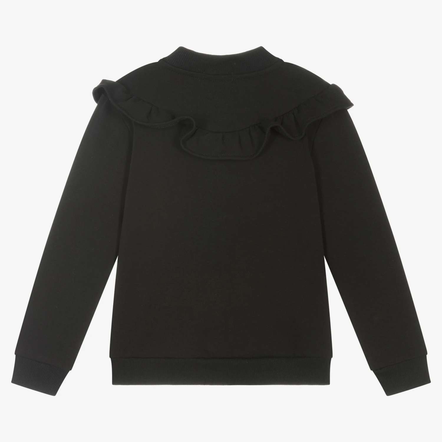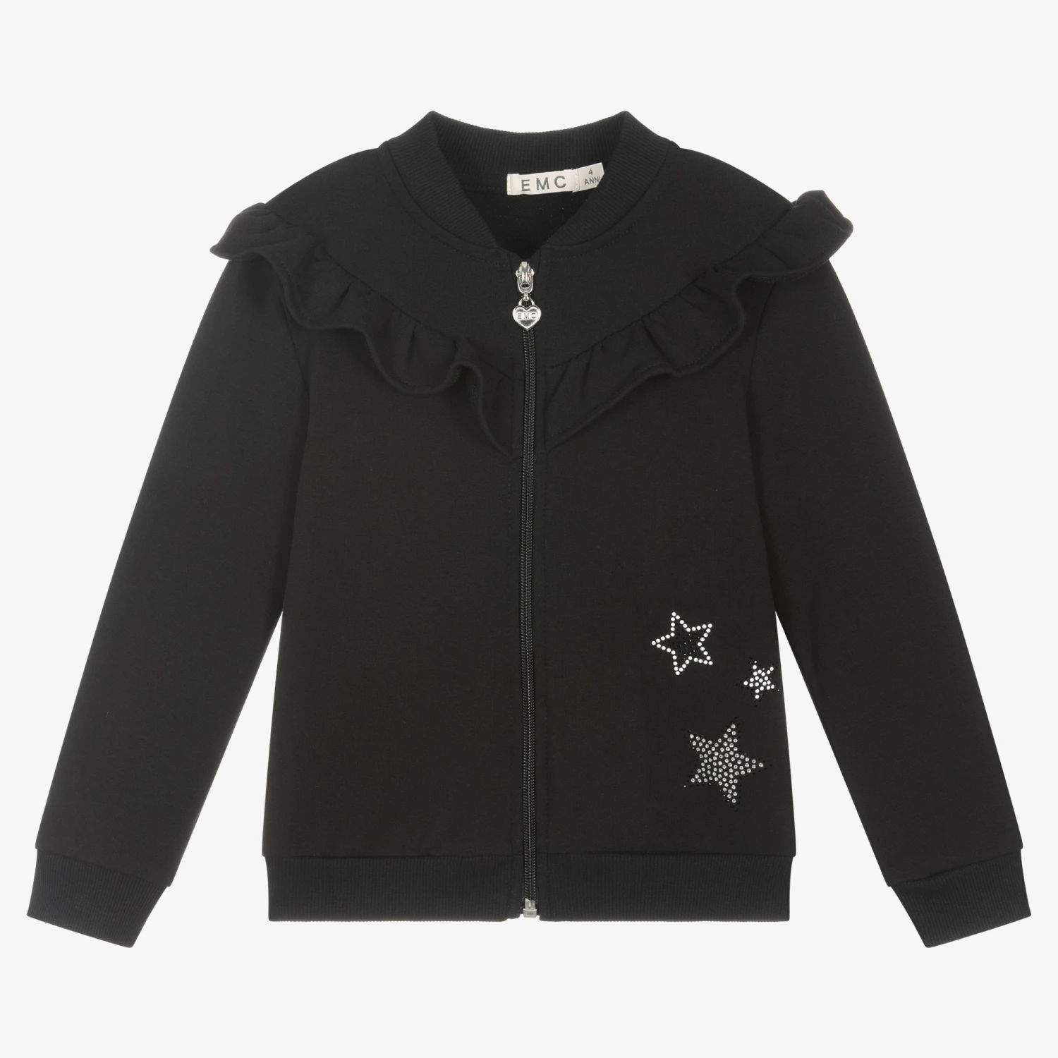 Black zip-up top for girls by Everything Must Change, made in soft cotton jersey. It has pretty ruffle trim and shiny beaded stars in black, white and silver.