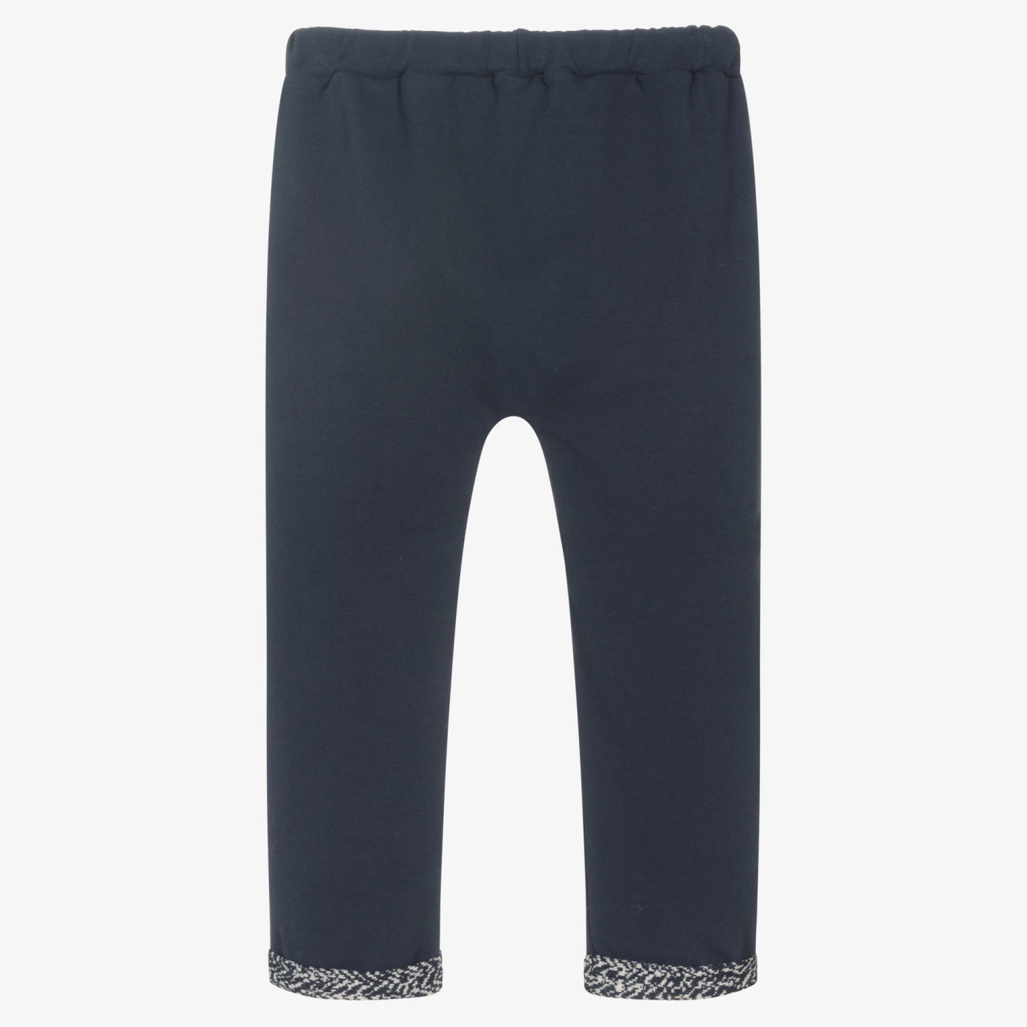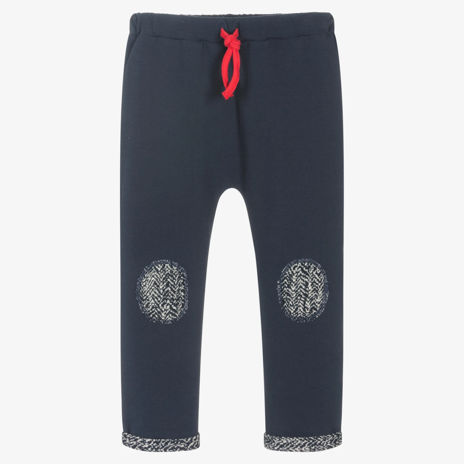 Comfortable navy blue joggers for younger girls by Everything Must Change. Made in soft cotton jersey, they have patterned knee pads with matching trim on the cuffs. The waistband is elasticated with a faux red tie detail.