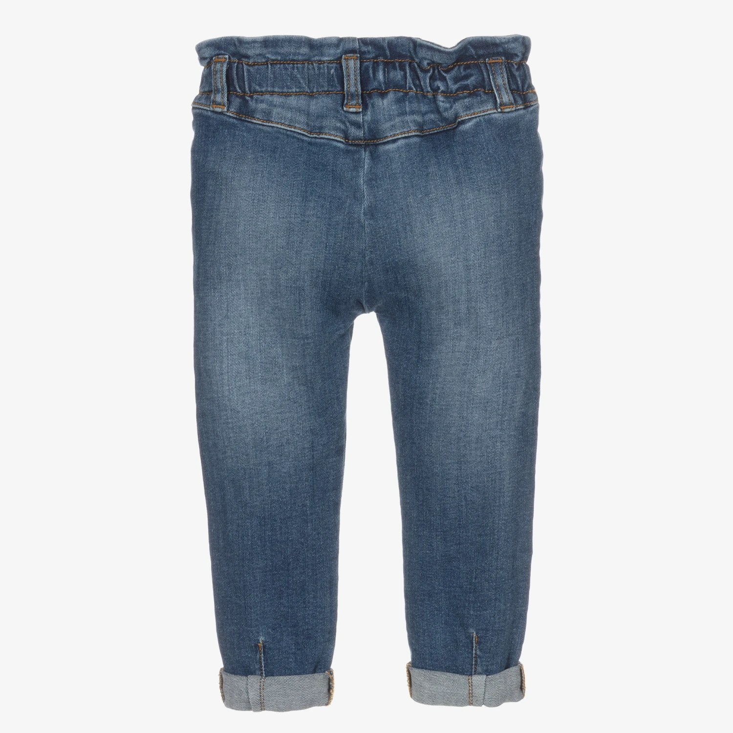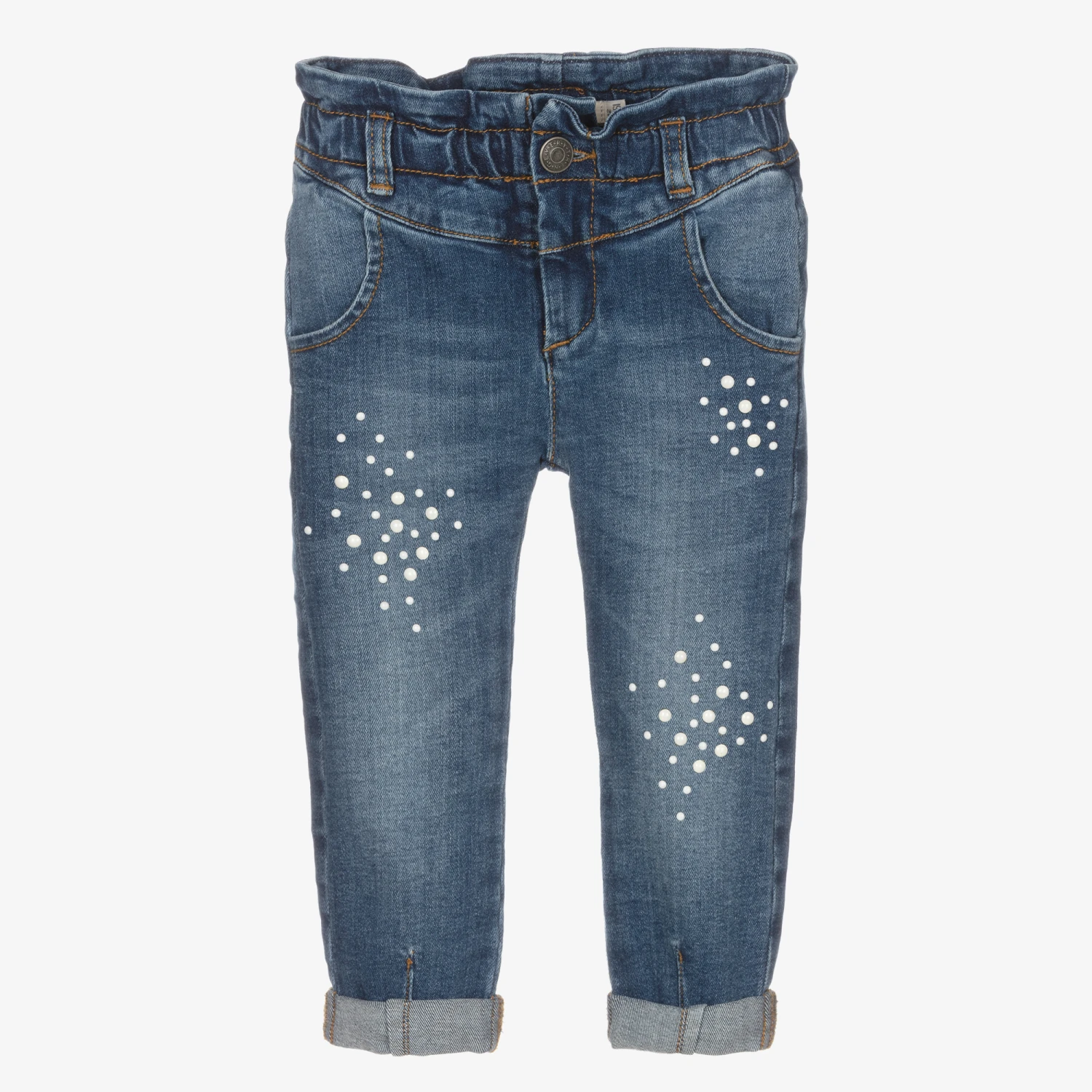 Blue jeans for girls by Everything Must Change, made in soft stretch denim. They have a worn and faded look, and are decorated with white studs on the front. There are front pockets, fixed turn ups, and the waistband is comfortably elasticated, with a button and zip fastening.