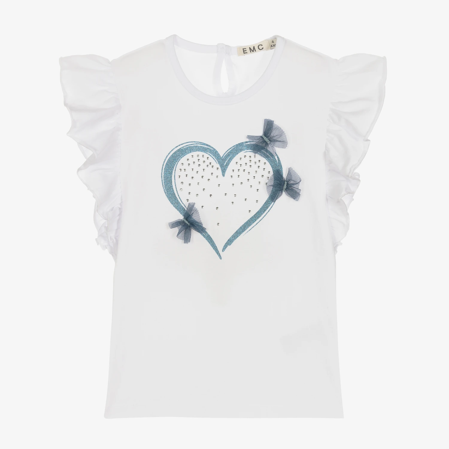 Lovely white T-shirt for girls by Italian brand Everything Must Change, made in soft, comfortable cotton jersey. With pretty ruffles over the shoulders, it has a blue glittery heart motif with silver studs and appliqué blue mesh ribbons on the front. There is a neat keyhole button fastening on the back, making it easier to pop over little one’s heads.