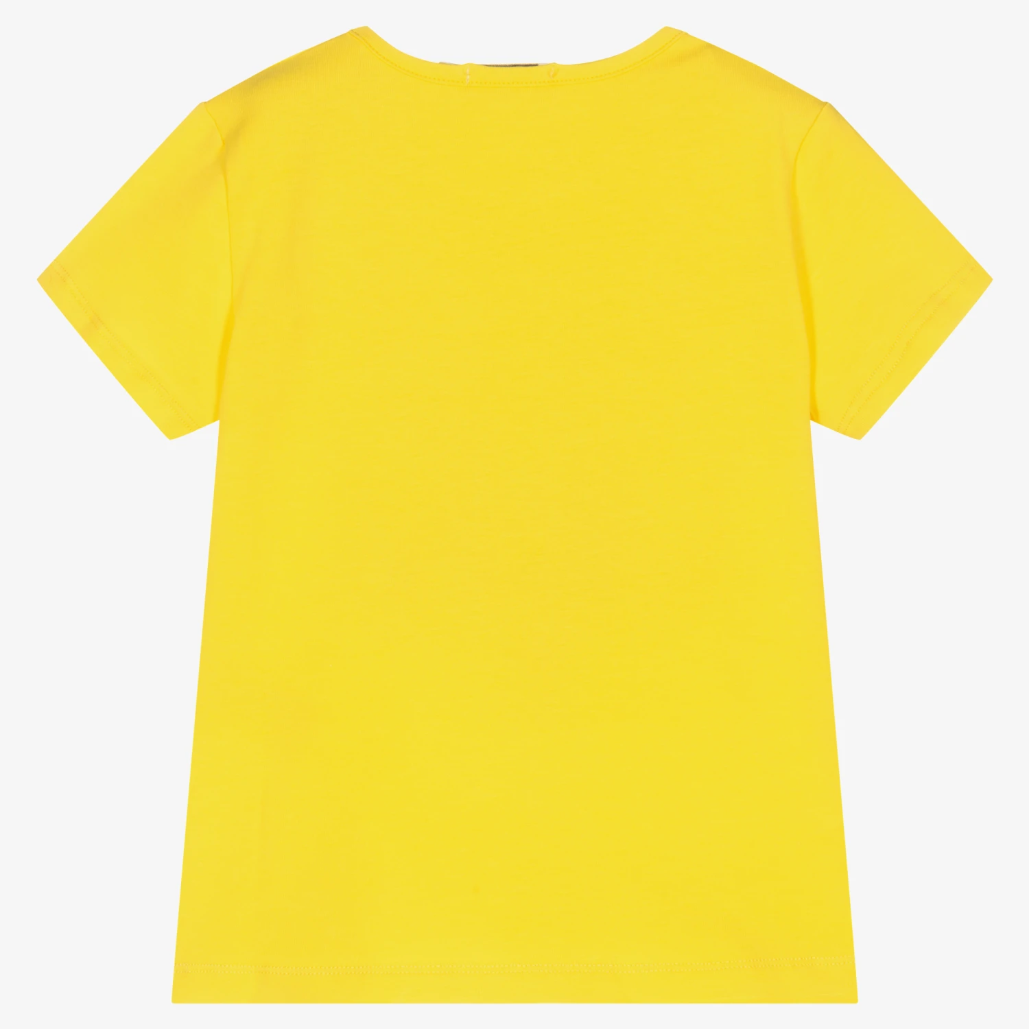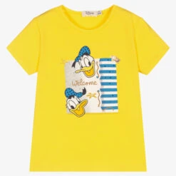 Yellow T-shirt for girls by Everything Must Change. Made in comfortable cotton jersey, it has a blue, yellow and white Donald Duck print on the front, sparkling with rhinestones.