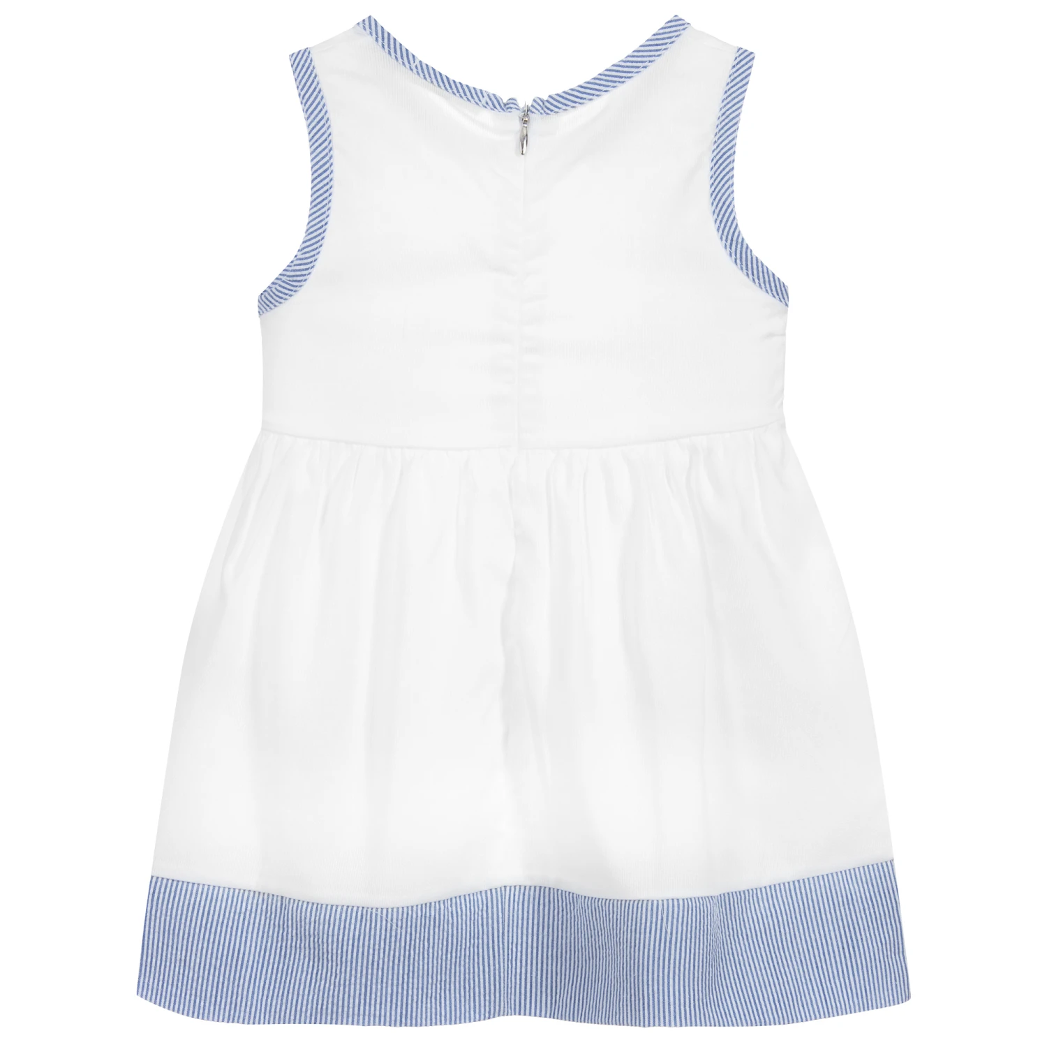 Baby girls white, lightly ribbed cotton dress by Everything Must Change. It has blue and white striped trims and a red chiffon flower appliqué.