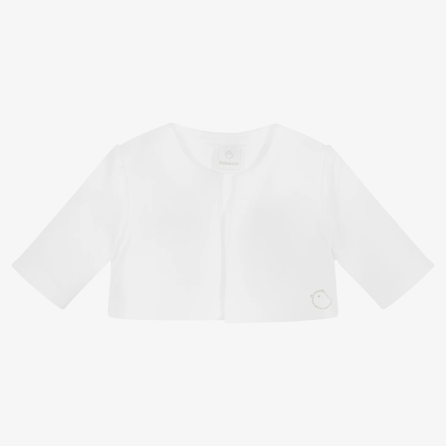 Pretty white bolero style cardigan for little girls from Italian brand Falcotto by Naturino. Made in soft, mid-weight cotton jersey, it has a cute glittery silver chick logo on the front.