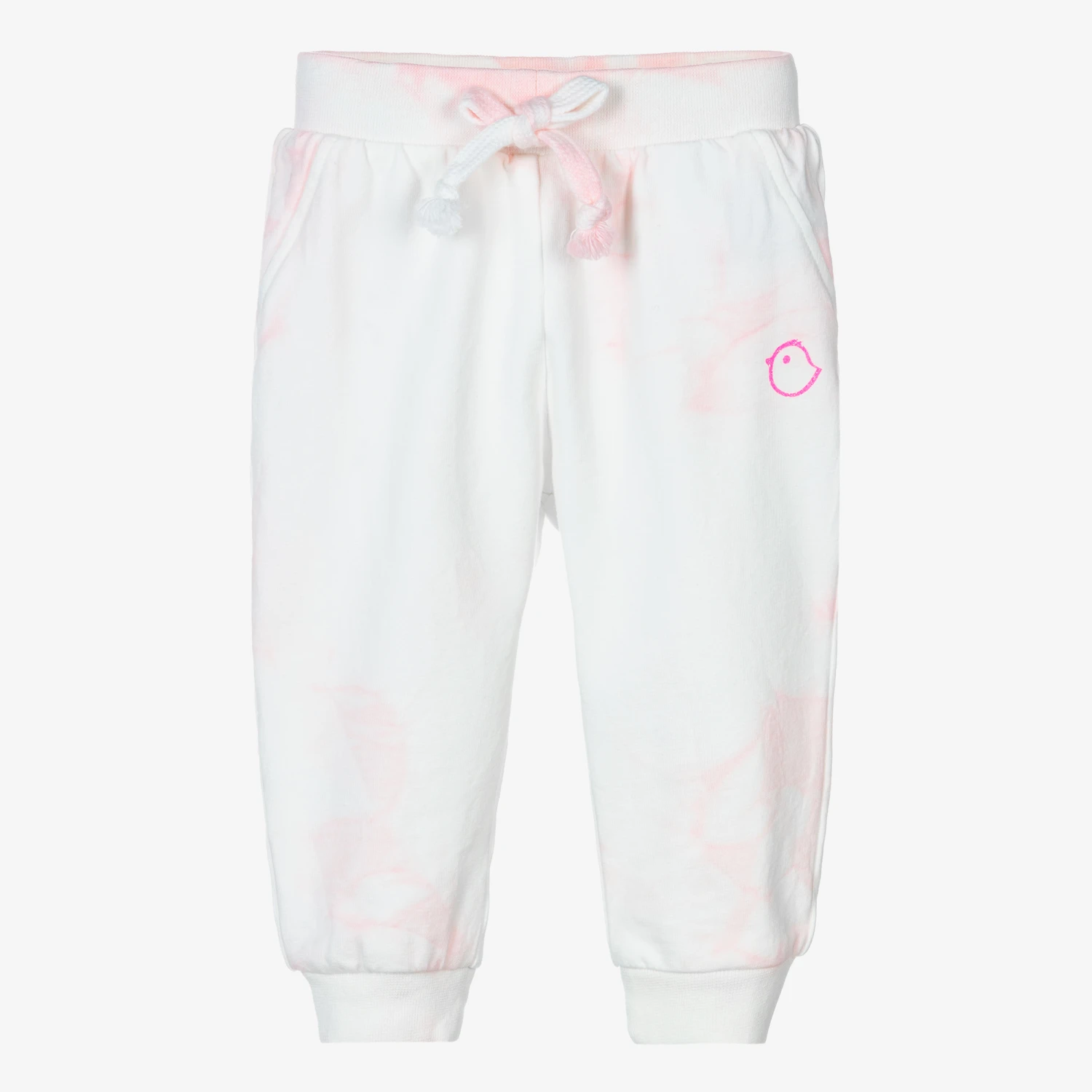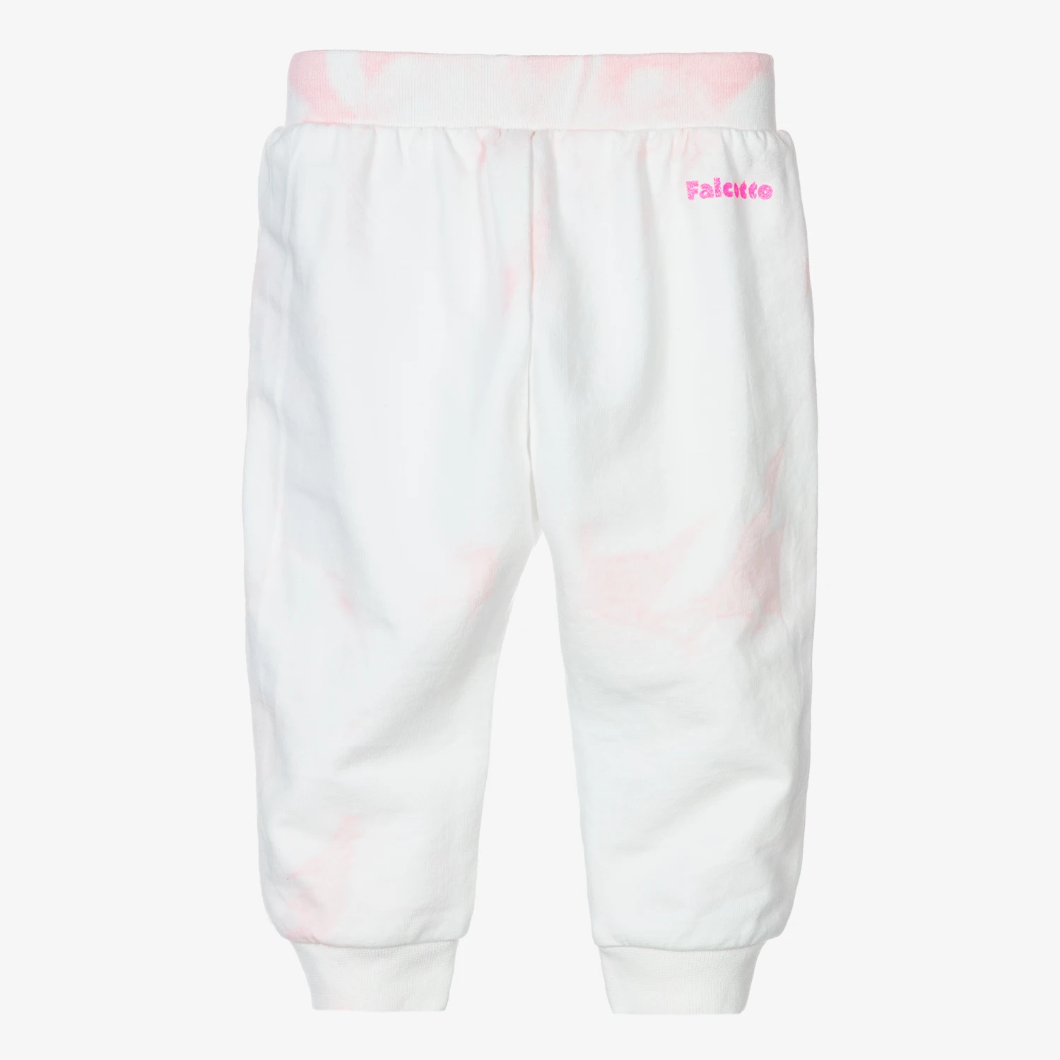 White and pink joggers for little girls from Falcotto by Naturino, with a lovely tie-dye pattern. Made in soft cotton jersey, this casual cuffed style has an elasticated waist with faux drawstring and pocket details on the front. For a designer touch, the Italian brand’s logos can be seen on the front and back in glittery pink print.