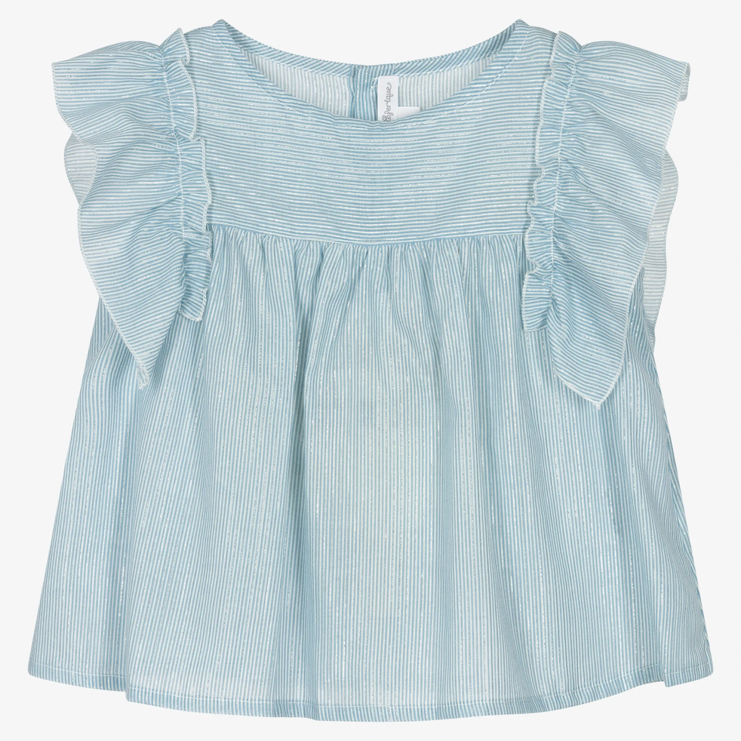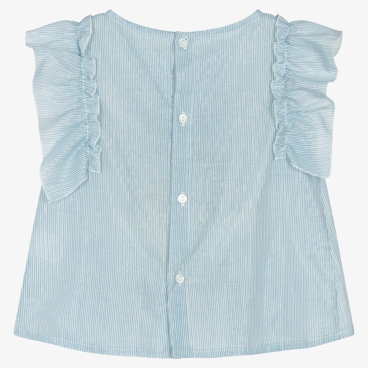 Eye-catching pale blue cotton blouse by classic Spanish brand Fina Ejerique, with shiny silver stripes. Made in lightweight cotton poplin, it is gathered below the bodice, has ruffles over the shoulders and fastens with buttons around the back.
