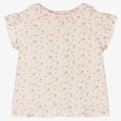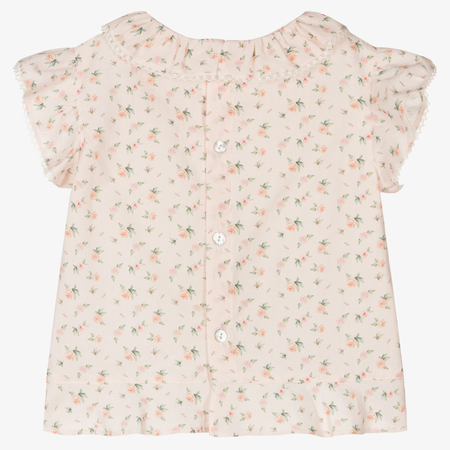 Light pink blouse for younger girls by Fina Ejerique, woven from soft and lightweight cotton. Patterned in beautiful rose buds, this pretty design has a ruffled collar with a delicate lace trim. It has a lightly ruffled hem and button fastenings on the back for a neat finish. This item contains recycled materials.