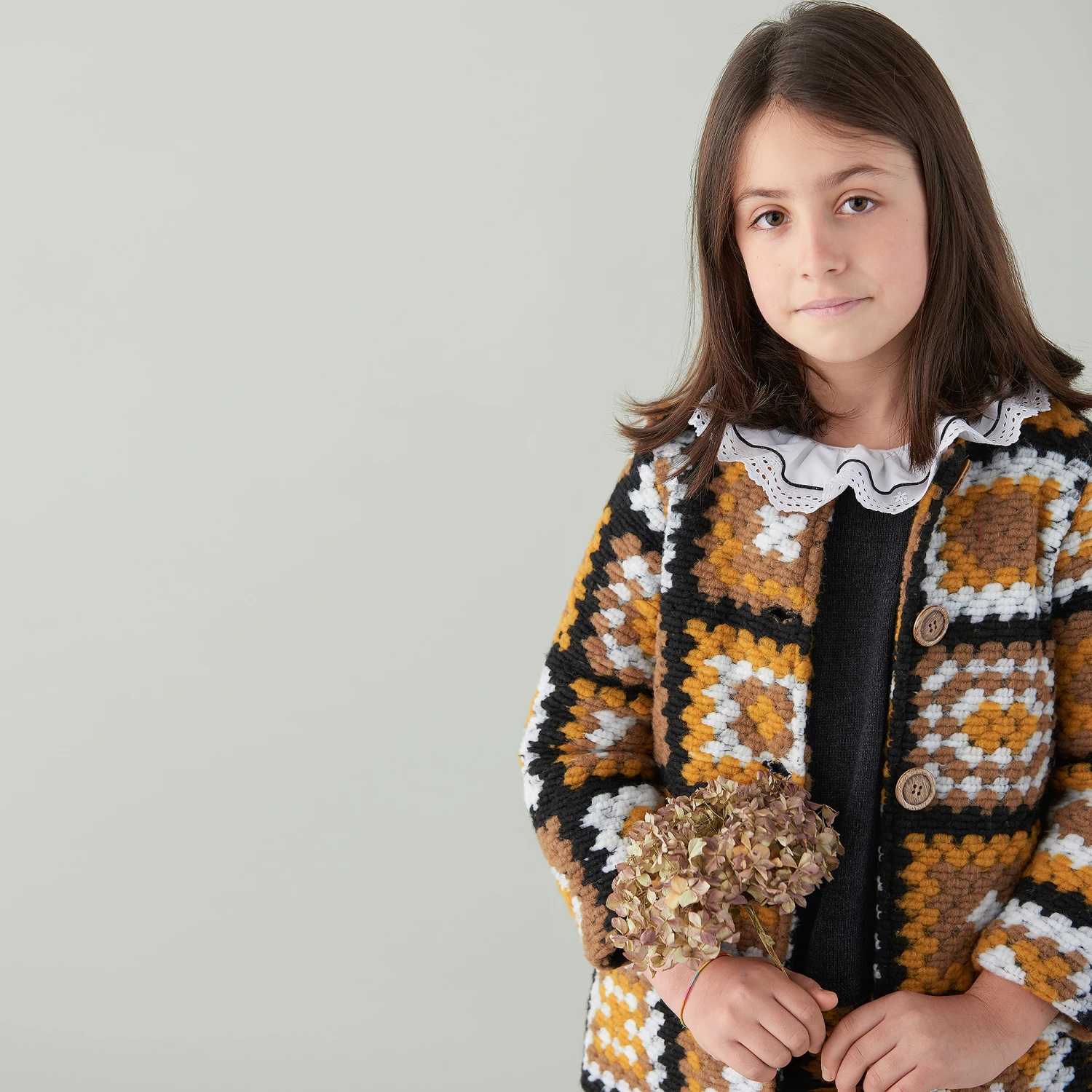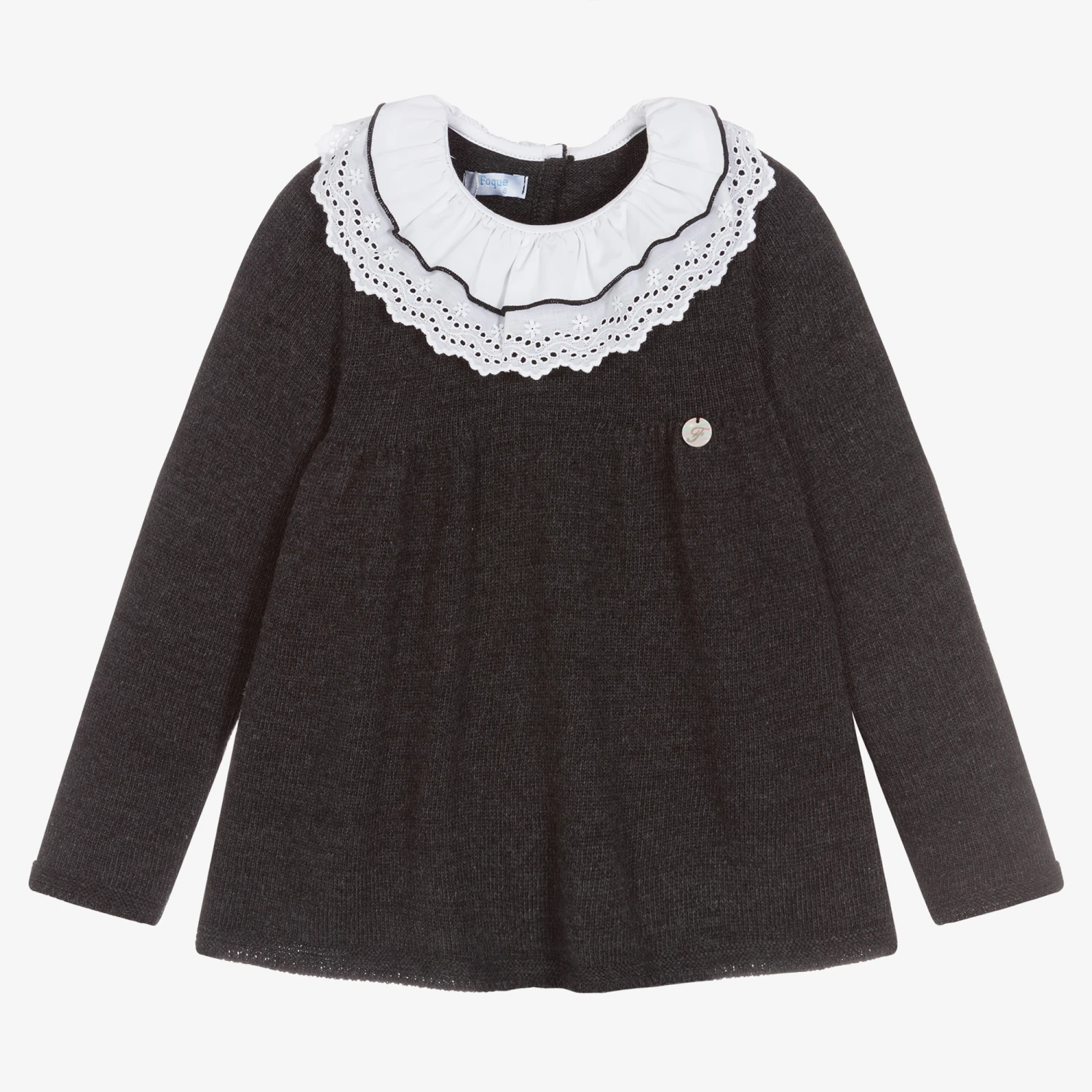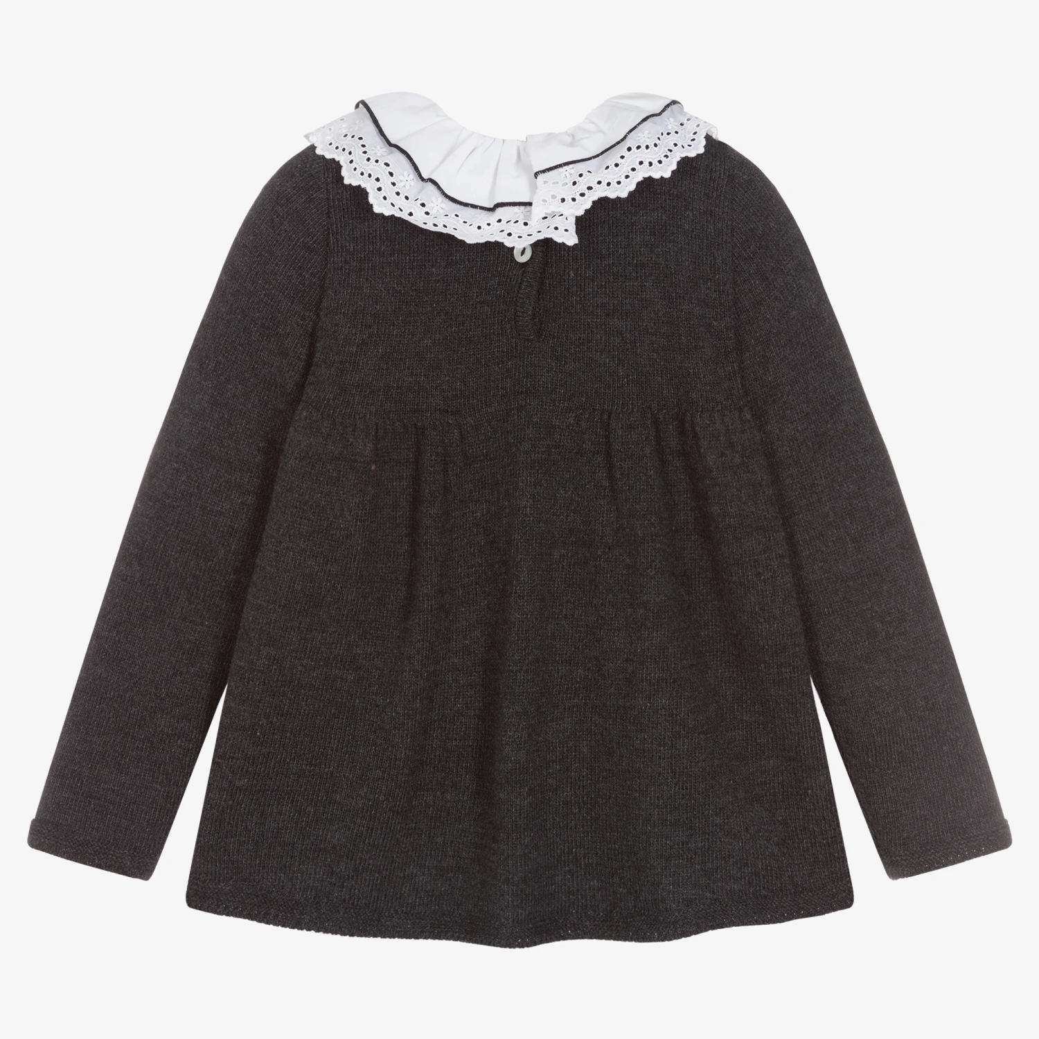 Charcoal grey sweater for girls by Foque, knitted in soft acrylic. Fastening with buttons on the back, it has a logo tab on the front and a white frilly collar with broderie anglaise edging.