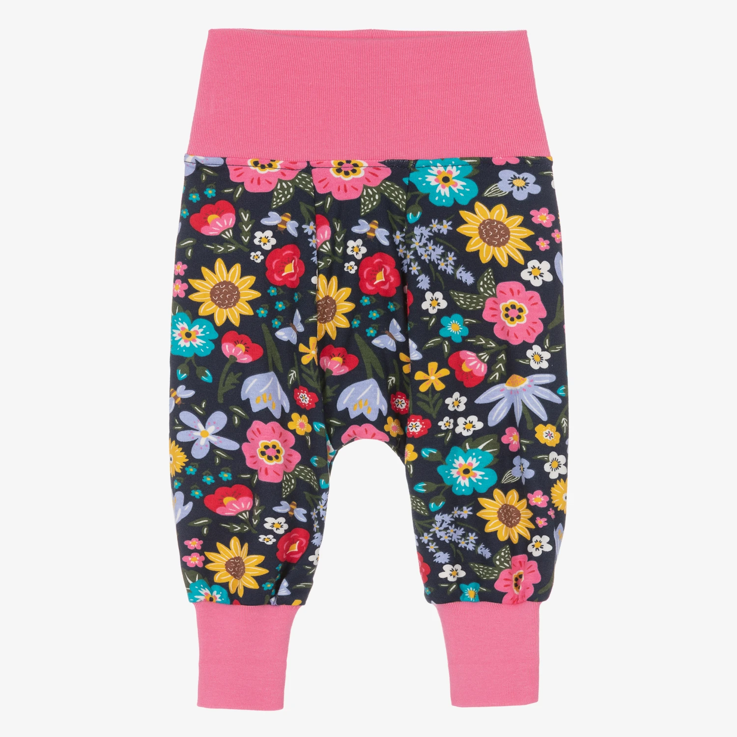 Comfortable navy blue joggers for little girls by British brand Frugi, with a colourful floral and bee print. Made in soft organic cotton jersey that is gentle on delicate skin, they are designed with a roomy fit to cover cloth nappies. The contrast pink fold-over waistband and cuffs can be extended to allow for growth spurts.