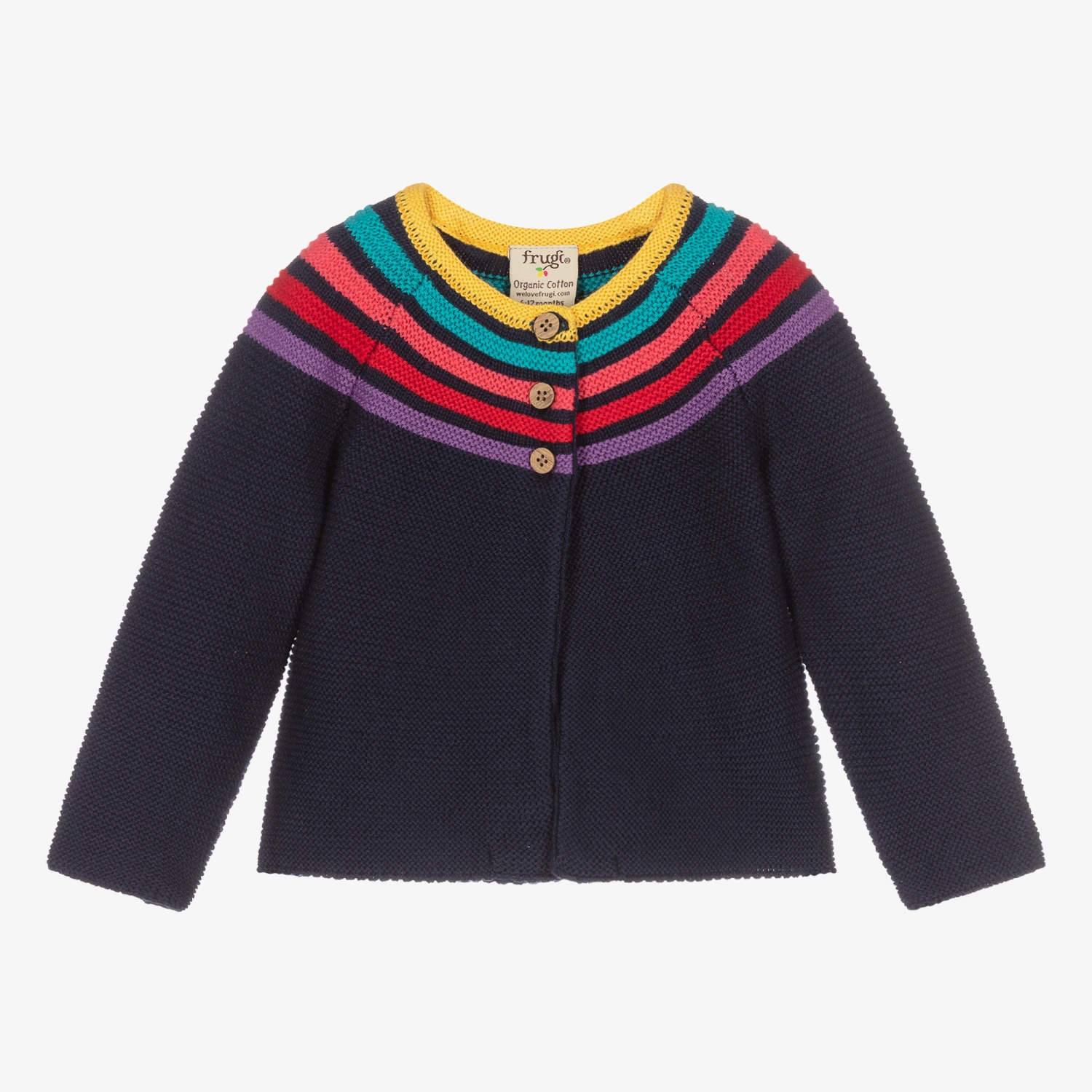 Navy blue cardigan for girls by British brand Frugi, knitted in soft organic cotton. It has colourful rainbow stripes and wooden button fastenings.