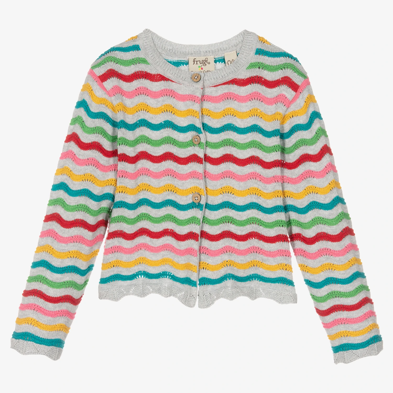 Pretty grey cardigan for girls by British brand Frugi, knitted in lightweight organic cotton. Patterned with colourful stripes with pointelle detailing, it has scalloped edges on the cuffs and hem and wooden-effect button fastenings on the front.