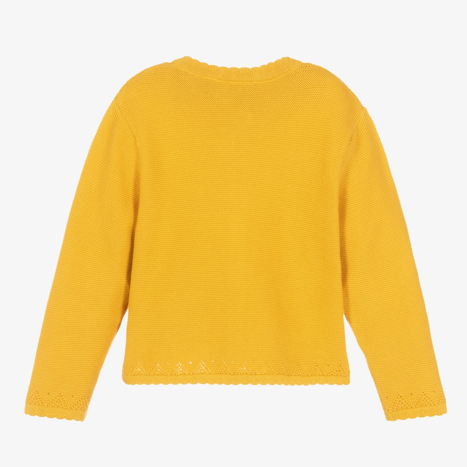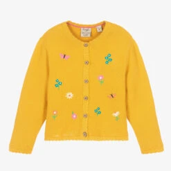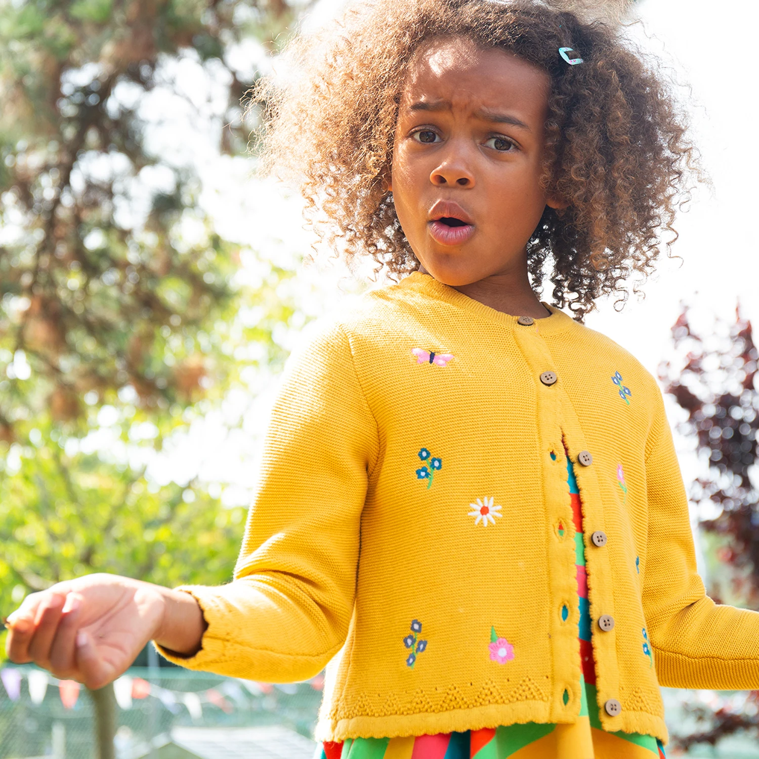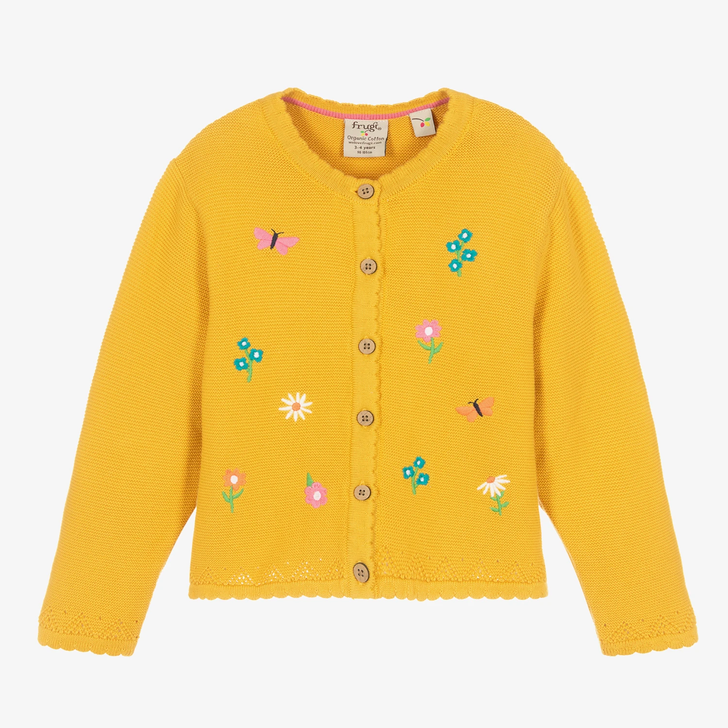 Yellow cardigan for girls by British brand Frugi, knitted in soft organic cotton. It has colourful embroidered flowers and butterflies on the front. There are pretty scalloped edges on the ribbed trims and lovely pointelle detailing on the cuffs and hem. It fastens with wood-effect buttons on the front.