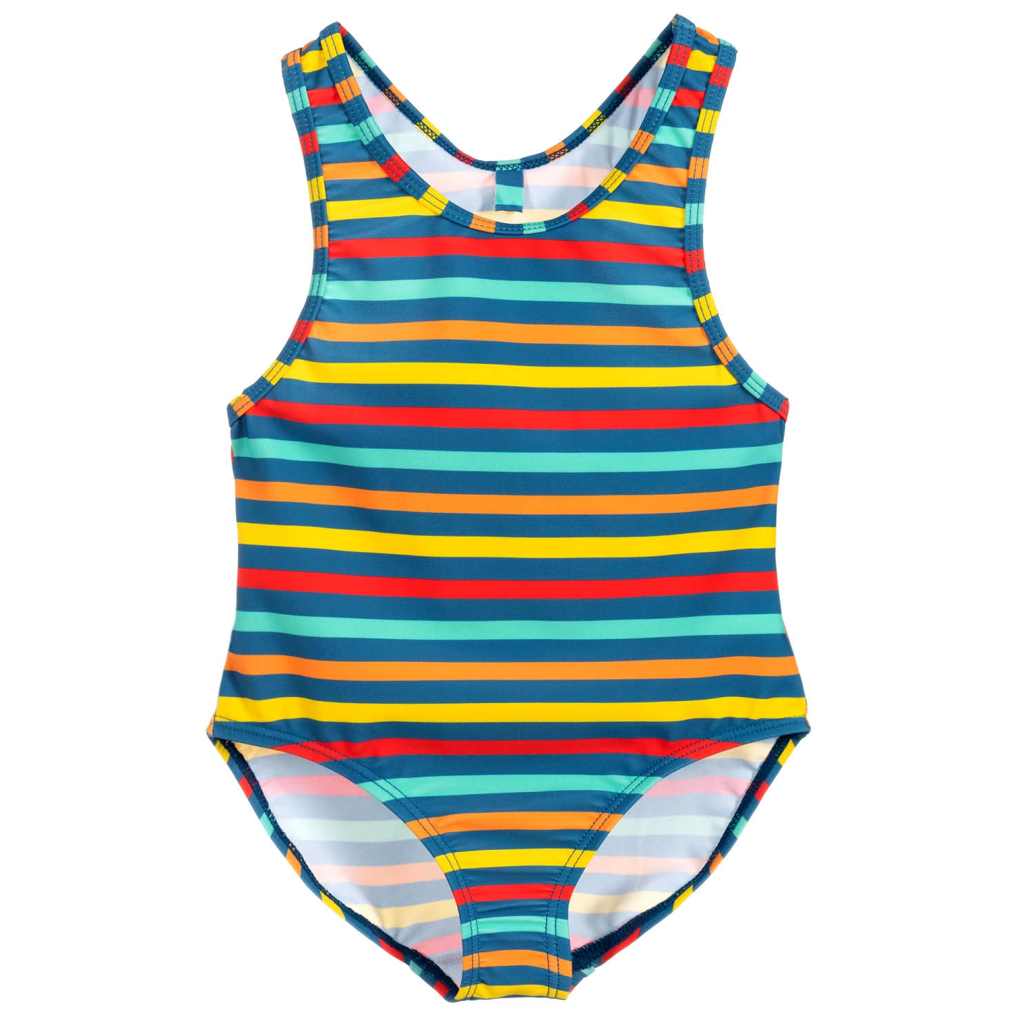 Girls colourful racer-back style swimsuit by Frugi, with red, yellow, orange and blue stripes. Silky smooth and stretchy with UPF50+, it is fully lined on the front and between the legs.