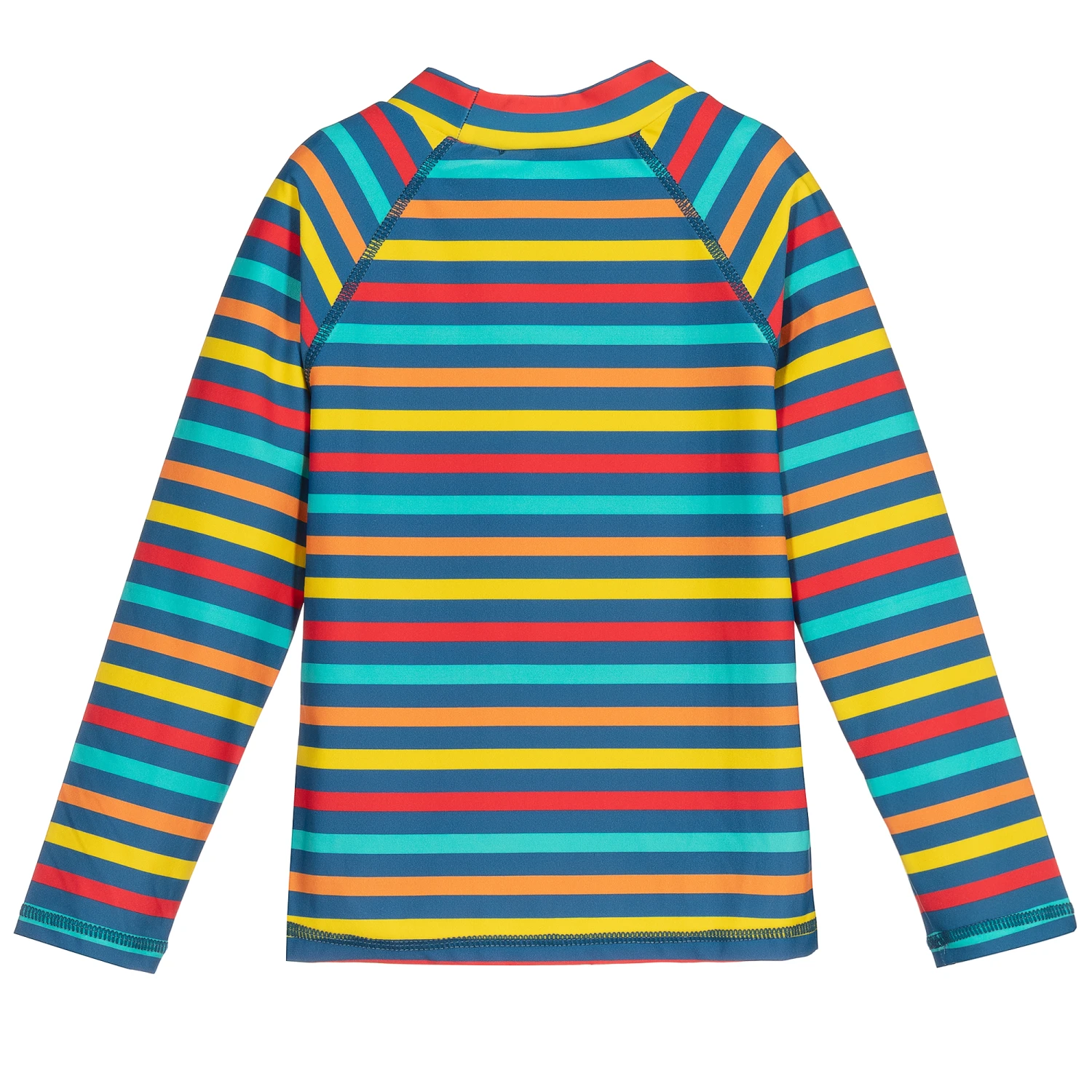 Colourful striped sun protective top for girls by Frugi. Silky smooth and stretchy, with long sleeves, it has a UPF40+, ideal for children’s sensitive skin.