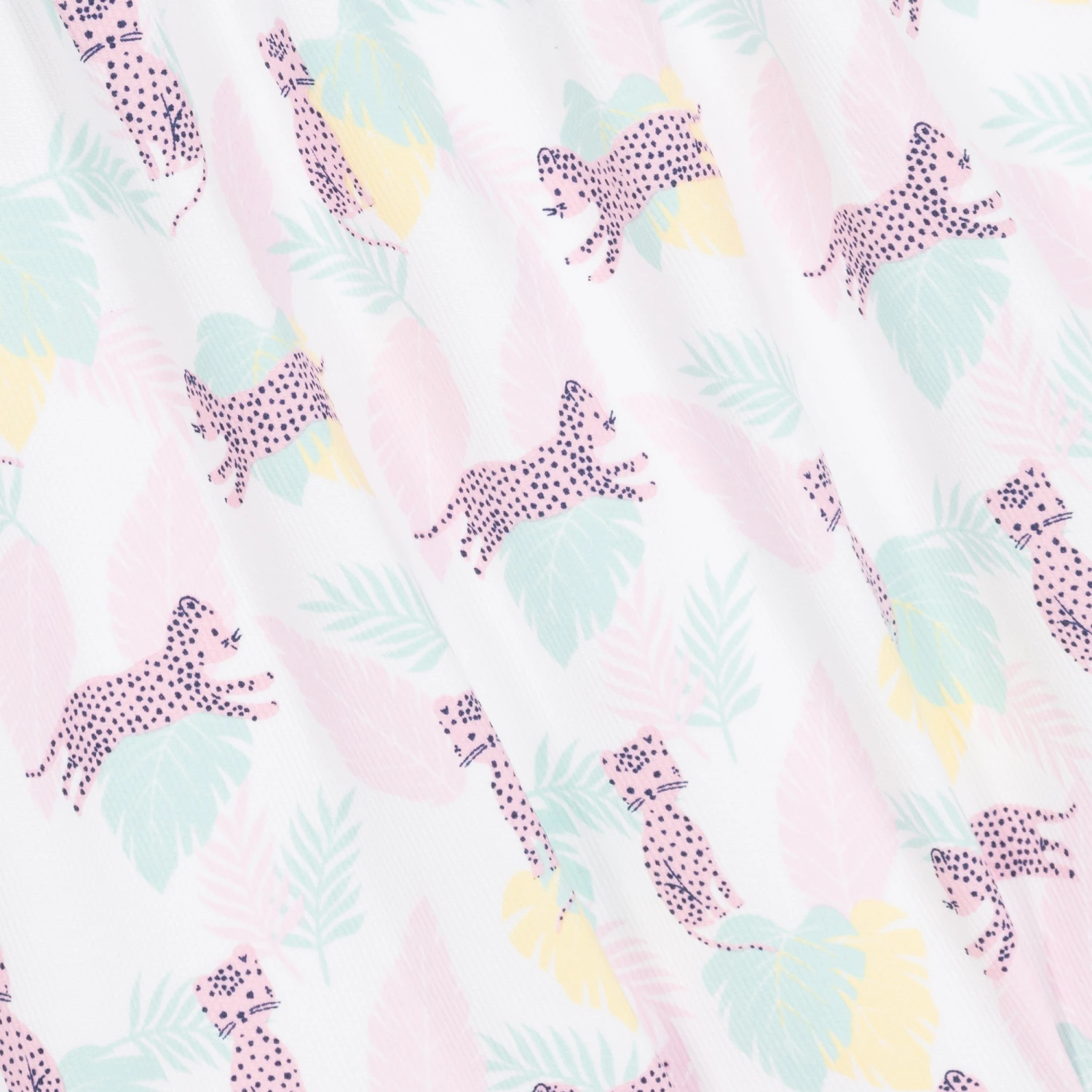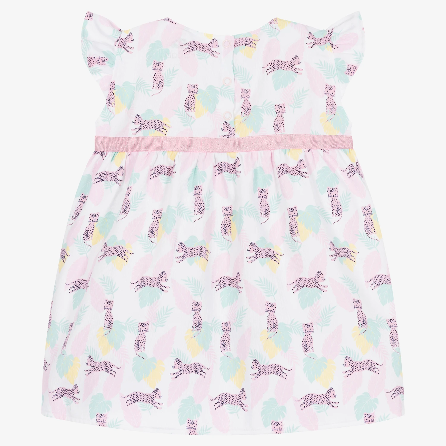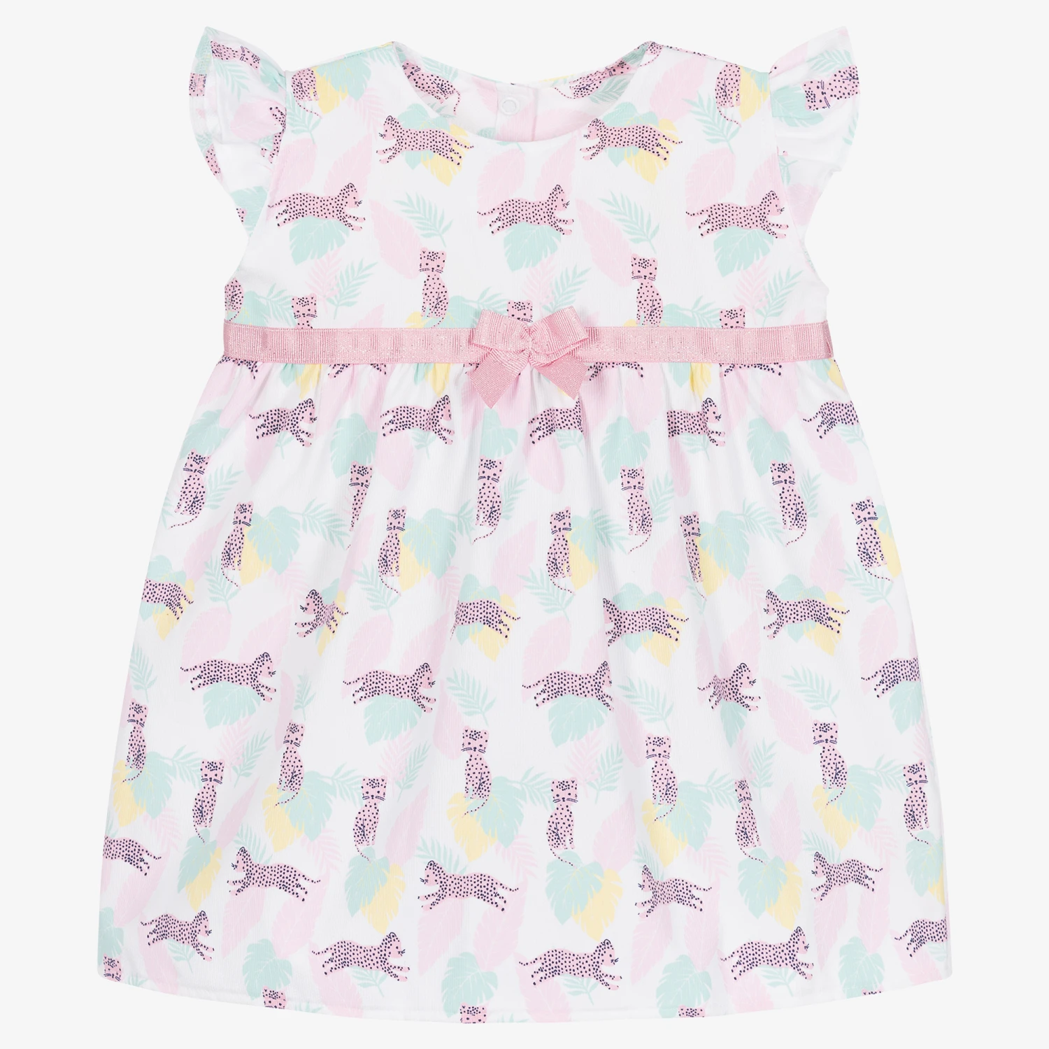 Adorable white cotton dress for little girls by FS Baby, with a cute spotty cat and leaf pattern, in lovely pastel shades of pink, green and yellow. Cool and comfortable to wear, it has pretty ruffle sleeves and a pink sparkling grosgrain ribbon bow on the front. The easy-to-use popper fastenings on the back help with quick dressing.