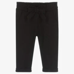 Smart black trousers for girls by Italian brand Fun & Fun, with a pretty bow detail on the waist. They are made in comfortable Milano jersey, with useful front pockets and an elasticated waistband for easy dressing. The fixed turn-up hems are a great finishing touch to these stylish trousers.