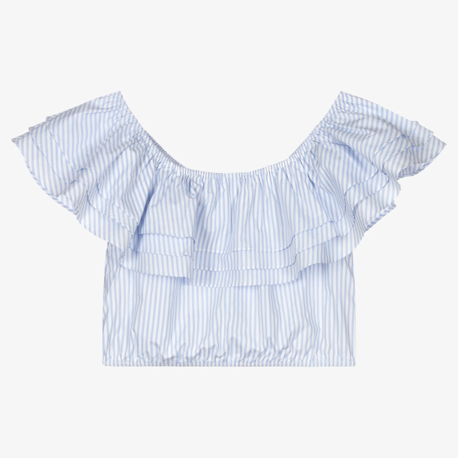 White and blue striped blouse for girls by Fun & Fun. It is made in smooth cotton poplin, with an elasticated waist and a cropped length. The neckline is elasticated and trimmed with layers of ruffles.