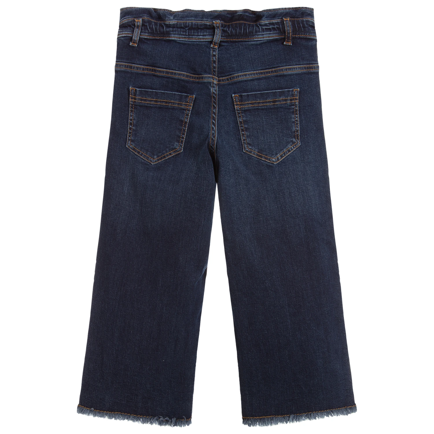 Designed for girls by Fun & Fun, a dark blue pair of cropped jeans with a frilled elasticated waistband. Made in stretchy denim, they have a classic five pocket design, contrasting orange stitching and raw edged hems. They have a useful adjustable waistband.