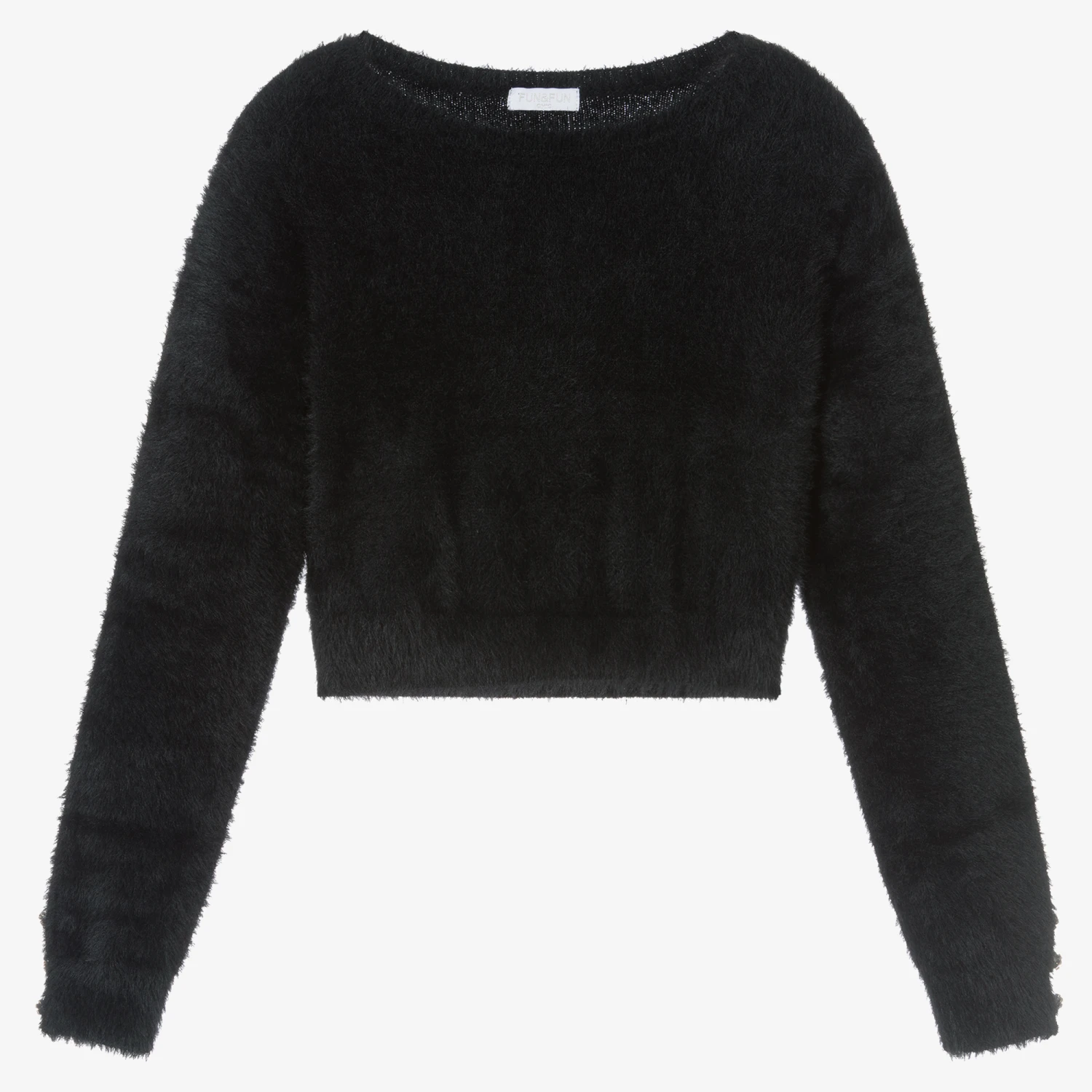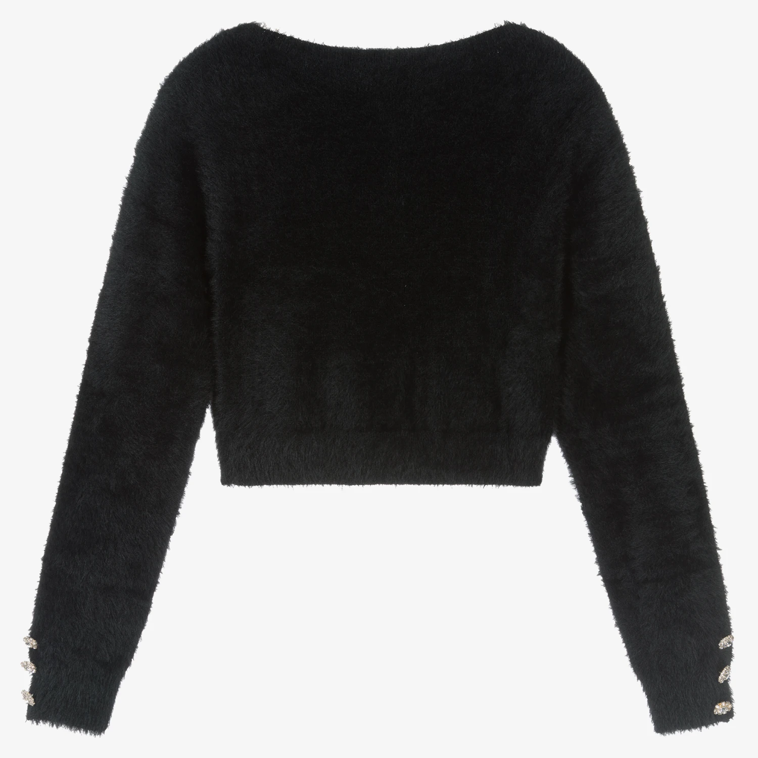 Super soft black jumper for girls by Fun & Fun Chic, with sparkly jewelled flower buttons on the cuffs. It is knitted in a fluffy acrylic and nylon blend and has a cropped length and ribbed trims.