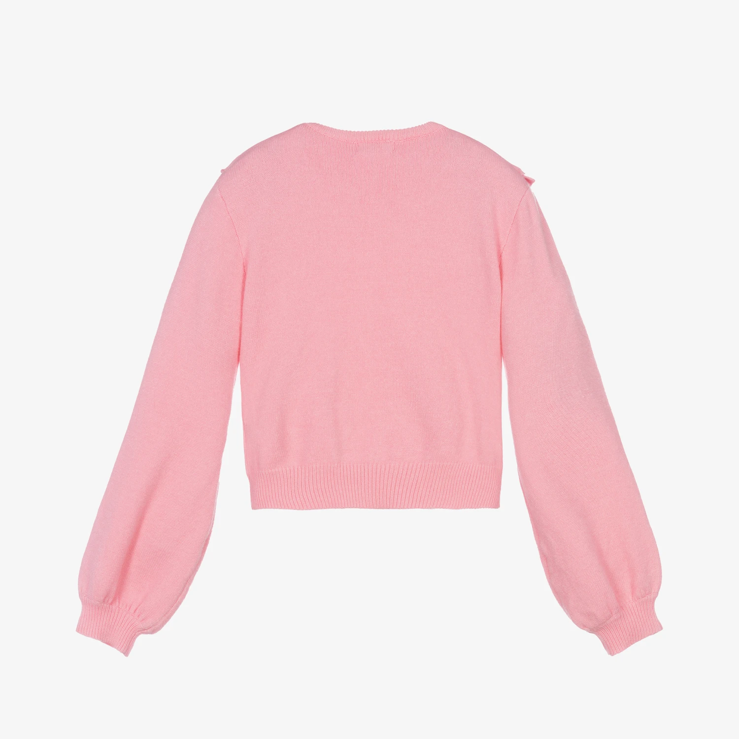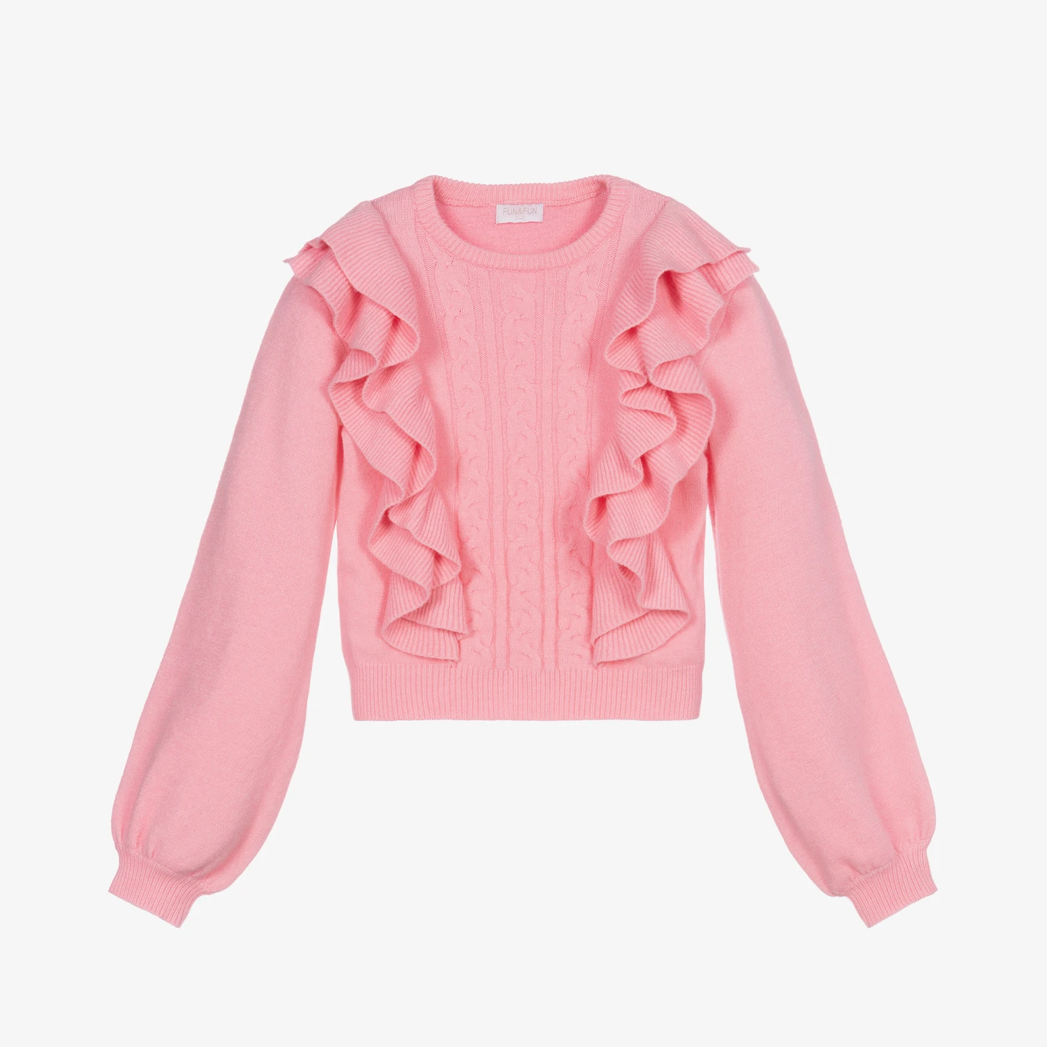 Gorgeous pink sweater for girls by Fun & Fun Chic, knitted from a soft viscose and nylon blend. It has eye catching frilly trims and a cable knit panel down the front for a classic and stylish look.