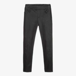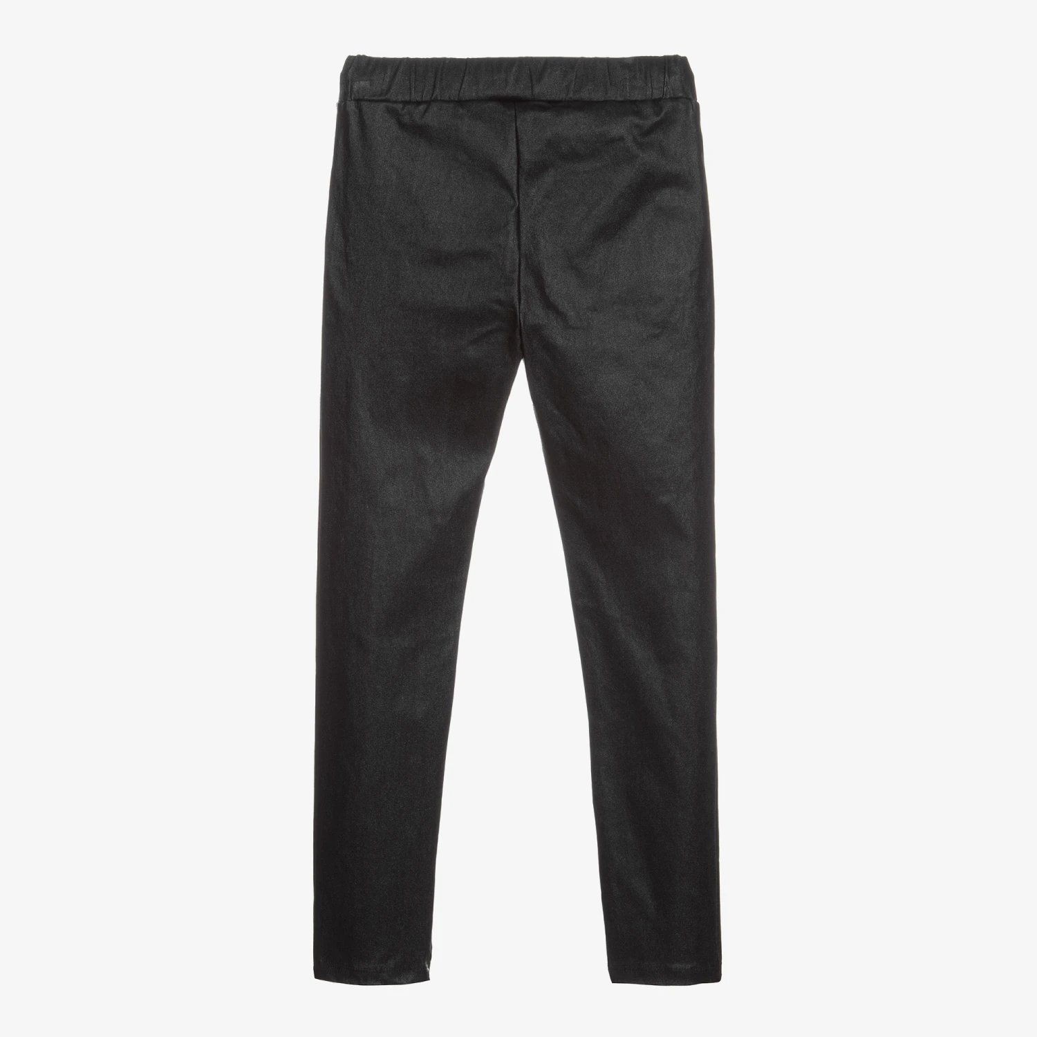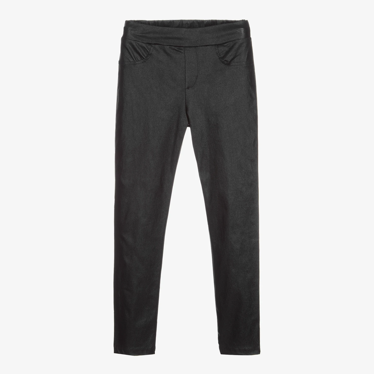 Black leggings for girls by Fun & Fun, made in mid-weight polyester, with some sparkle. Designed to look like trousers, they have two faux front pockets and an elasticated waist.