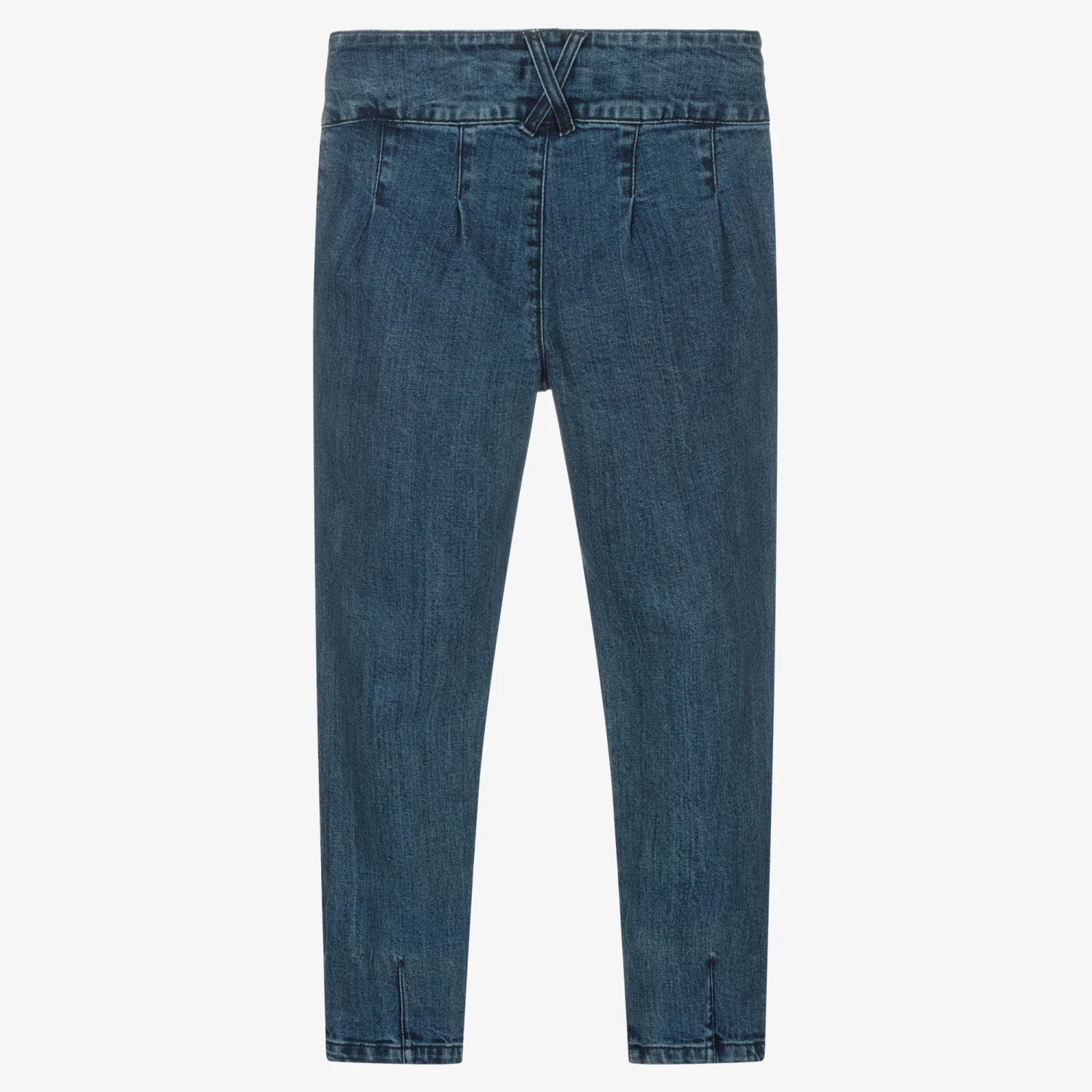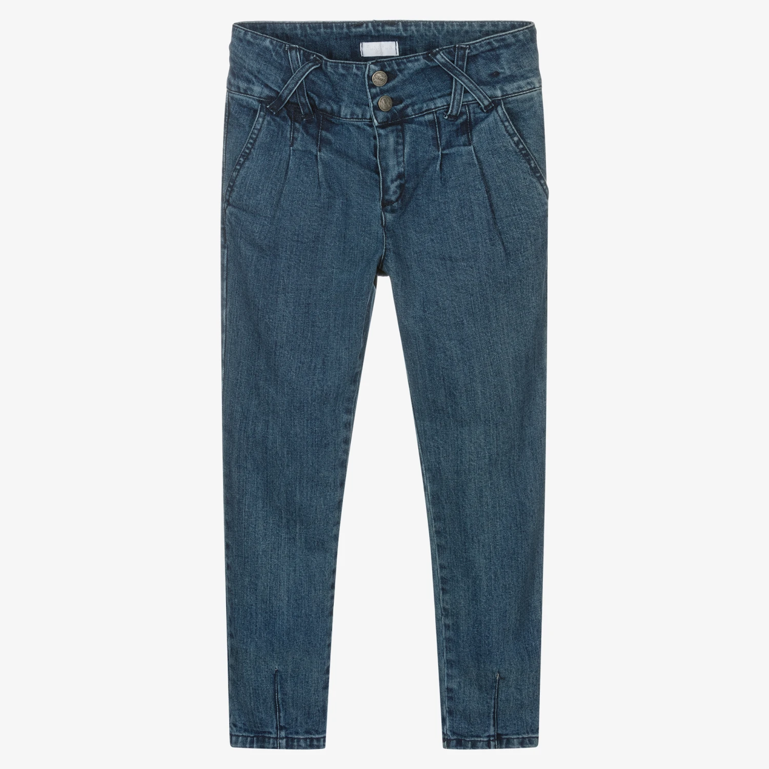 Girls mid-blue washed jeans from Fun & Fun, made in soft cotton denim with a slight stretch. A stylish twist on traditional jeans detailing, they have slanted pockets and pleats on the front and back creating a full leg that tapers to the turned-up ankle. The oversized adjustable waistband has eye-catching crossed belt loops and two decorative buttons to fasten, together with a zip.