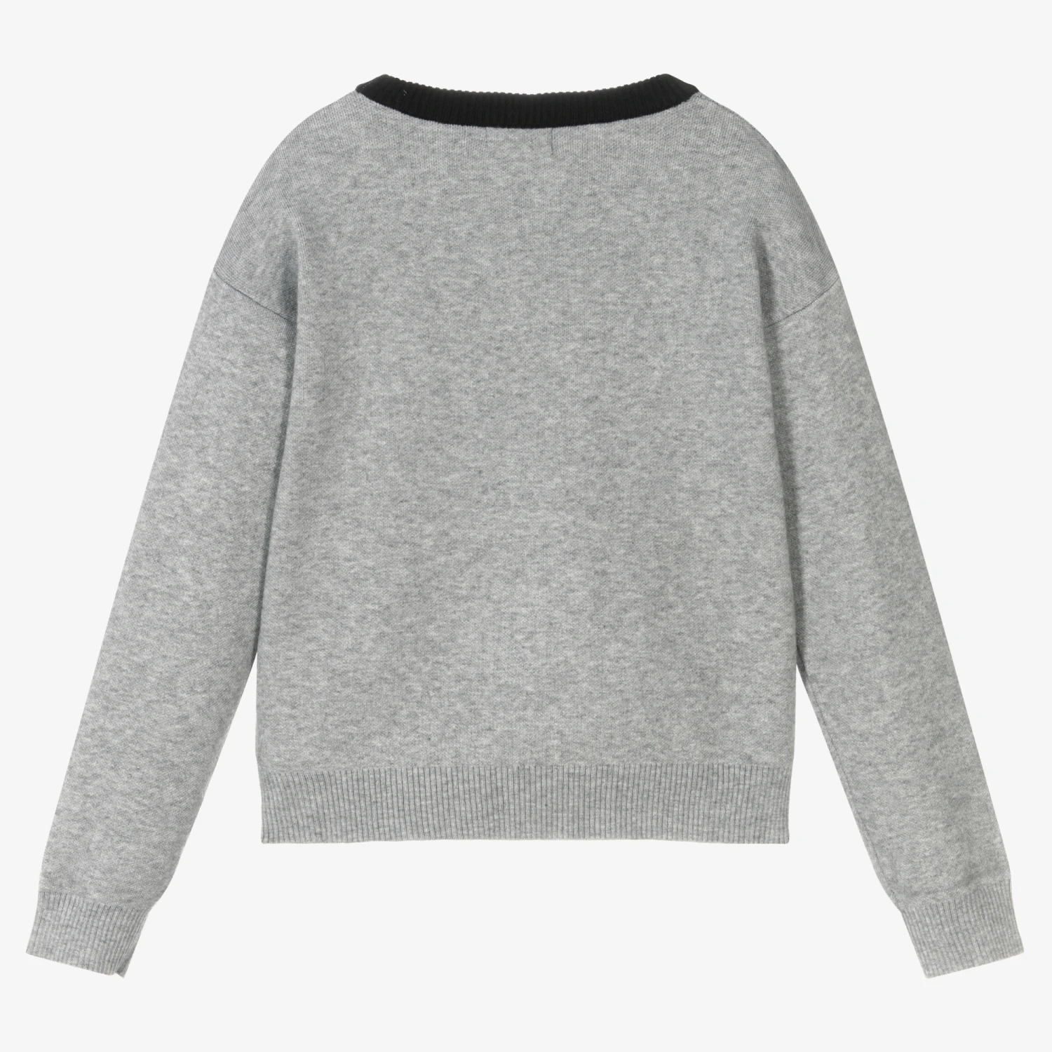 Grey knitted jumper for girls by Italian brand Fun & Fun, knitted in a viscose blend with a luxurious soft feel. It has a black and bright blue animal pattern on the front, with co-ordinating ribbed trim on the neckline and hem.
