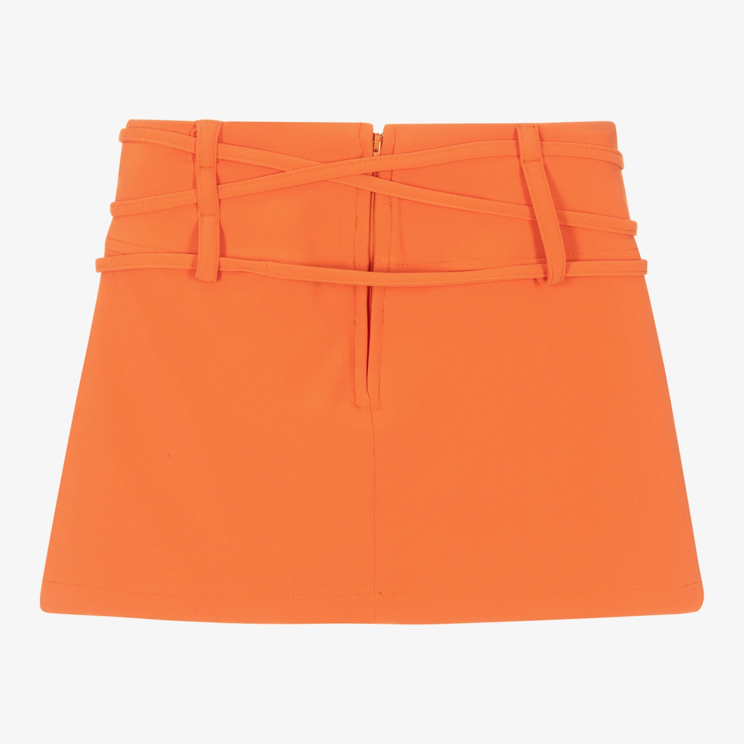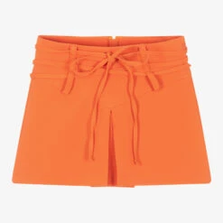 Orange skort for girls by Fun & Fun, made in soft and lightweight fabric. Secured with a zip fastening on the back, they have a single box pleat at the centre front and triple-layered belt loops on the waist. They sit high on the waist with an additional tie belt for effortless style.