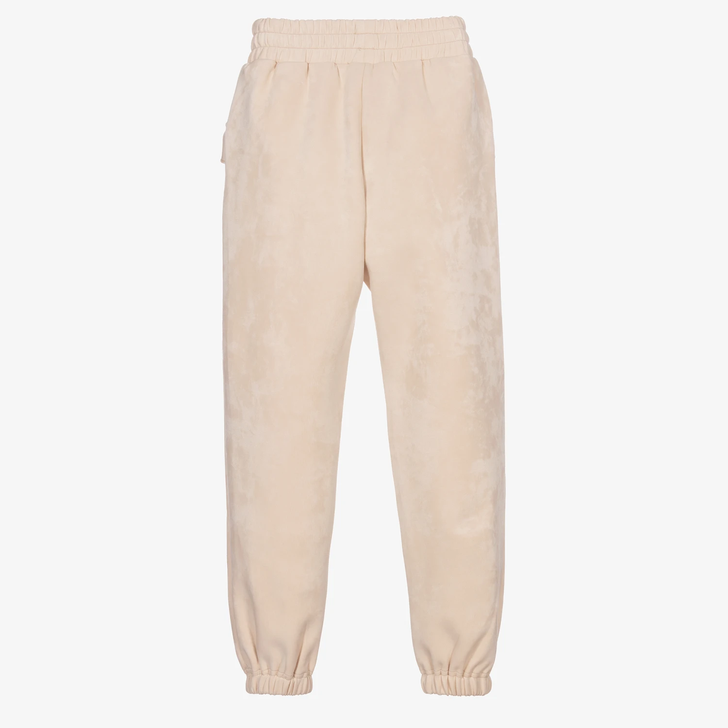 Pale beige joggers for girls by Fun & Fun, made in soft brushed polyester jersey. With a stretchy elasticated waist, they have two front pockets trimmed with pretty frills.