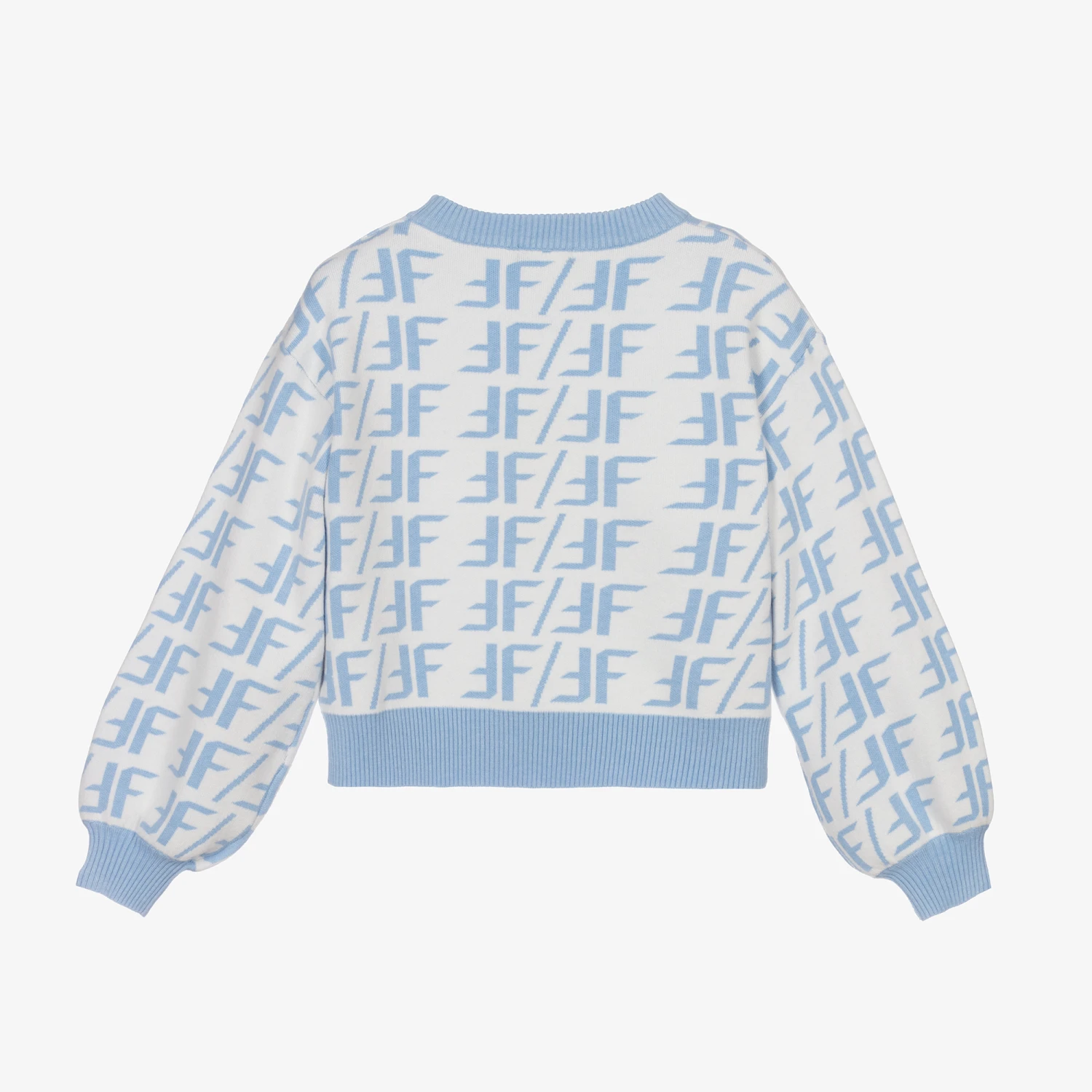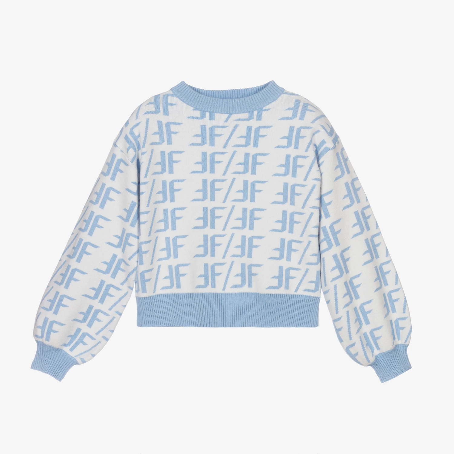 White and blue sweater for girls by Fun & Fun, made in a soft, mid-weight knit. It has a repeating logo design within the knit and ribbed trims.