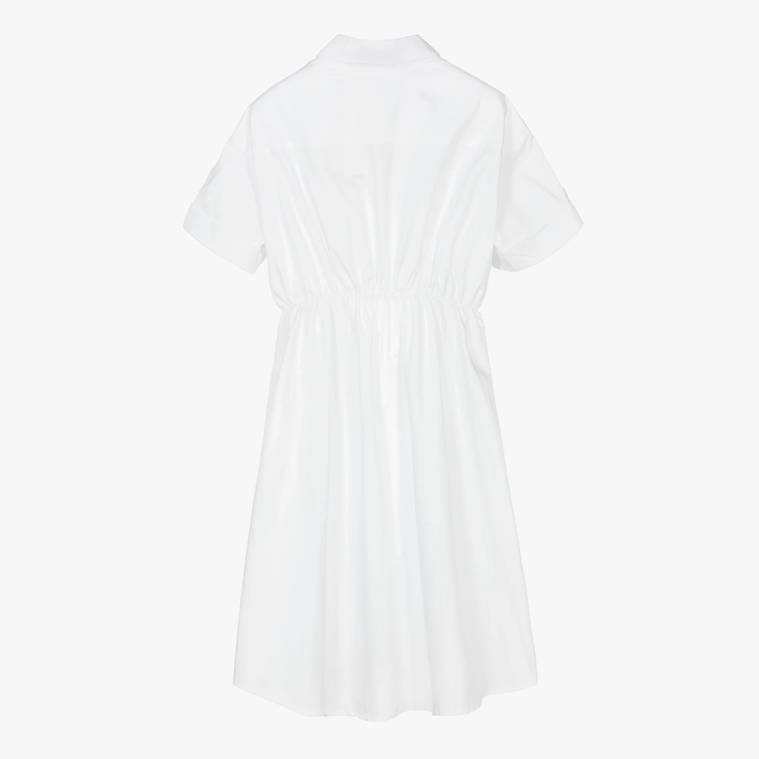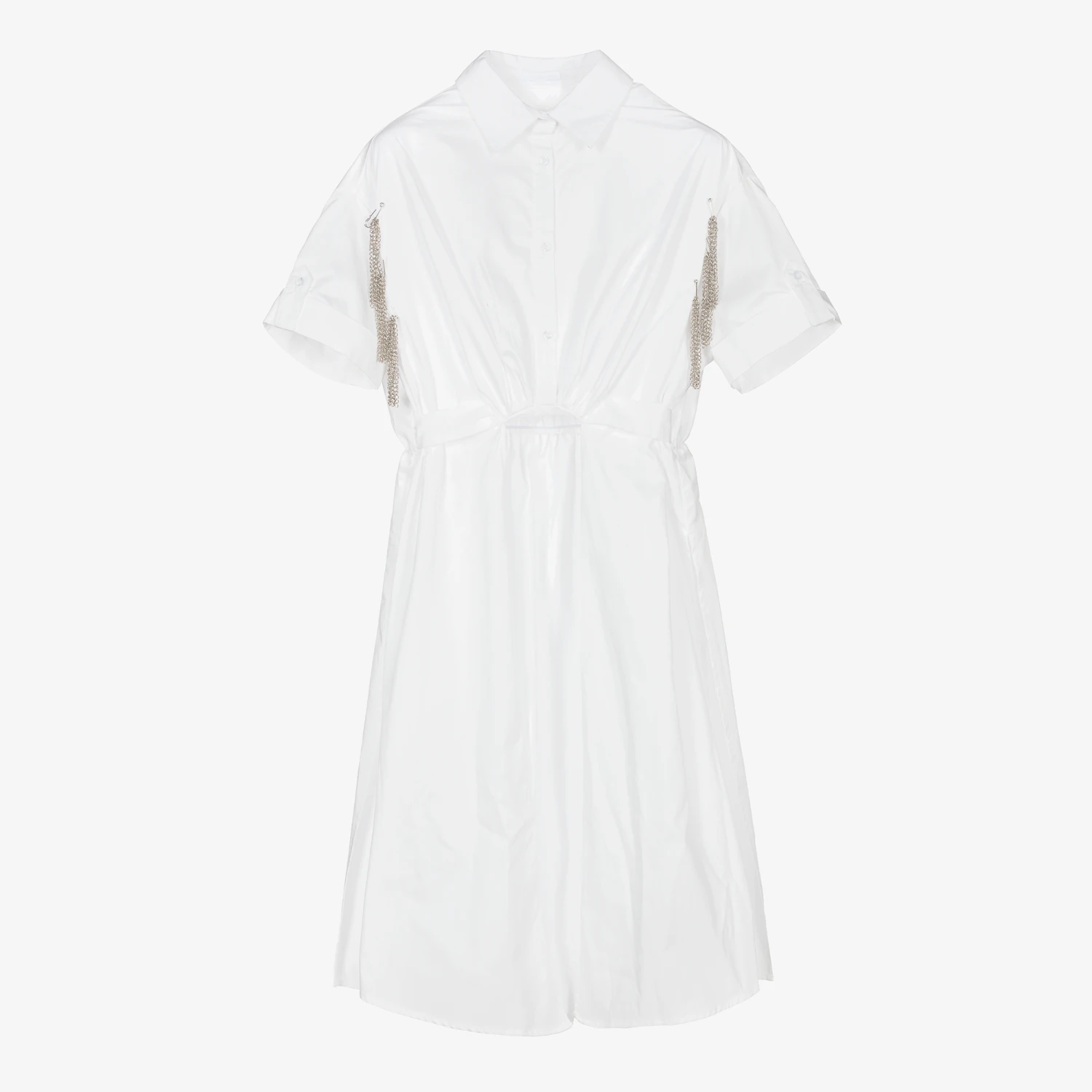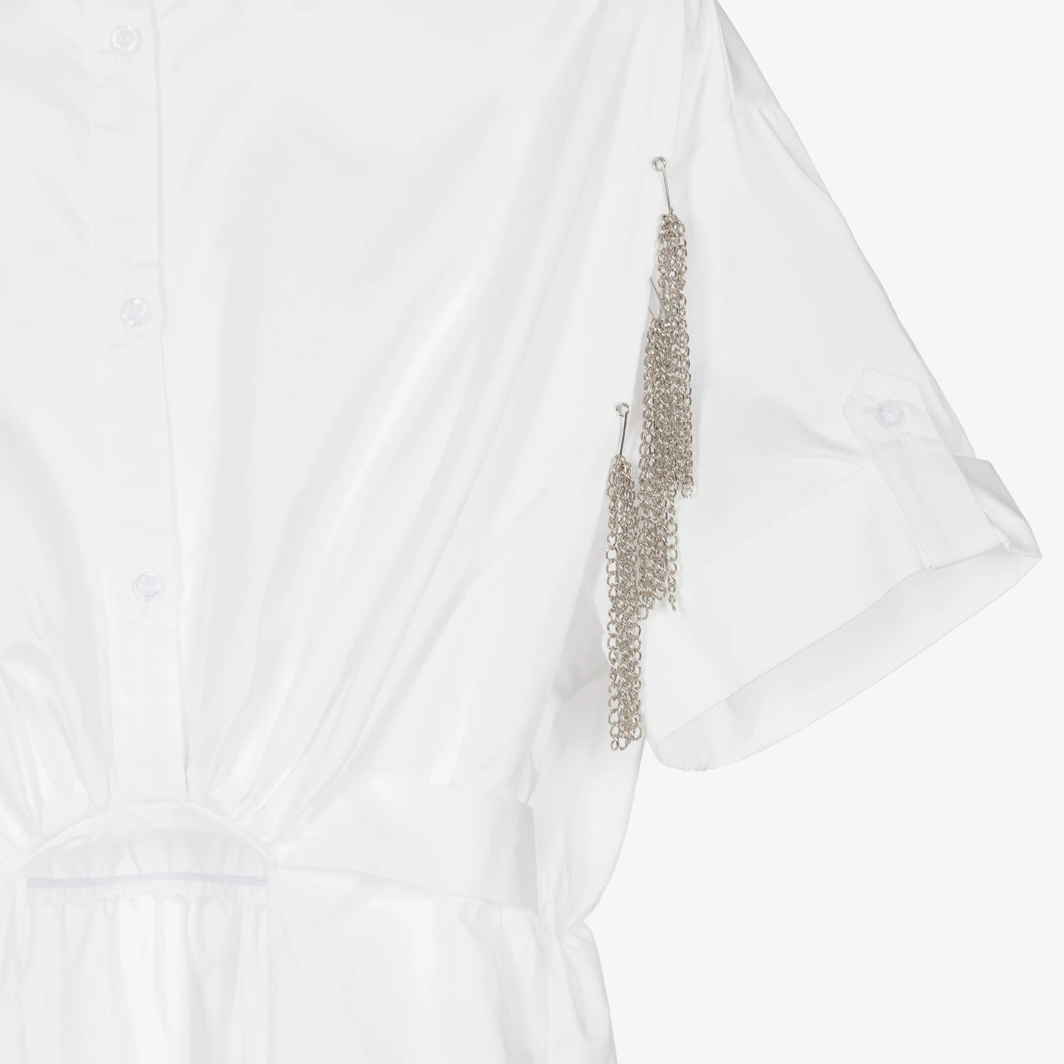 White tunic top for girls by Fun & Fun, made in smooth cotton poplin. The shirt-style bodice has a pointed collar and front button fastenings, with metal chain detailing and button tabs on the sleeves. The long-length hem is open at the front and has an elasticated waist at the back.