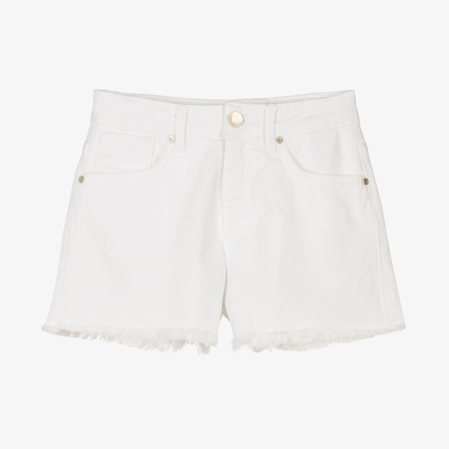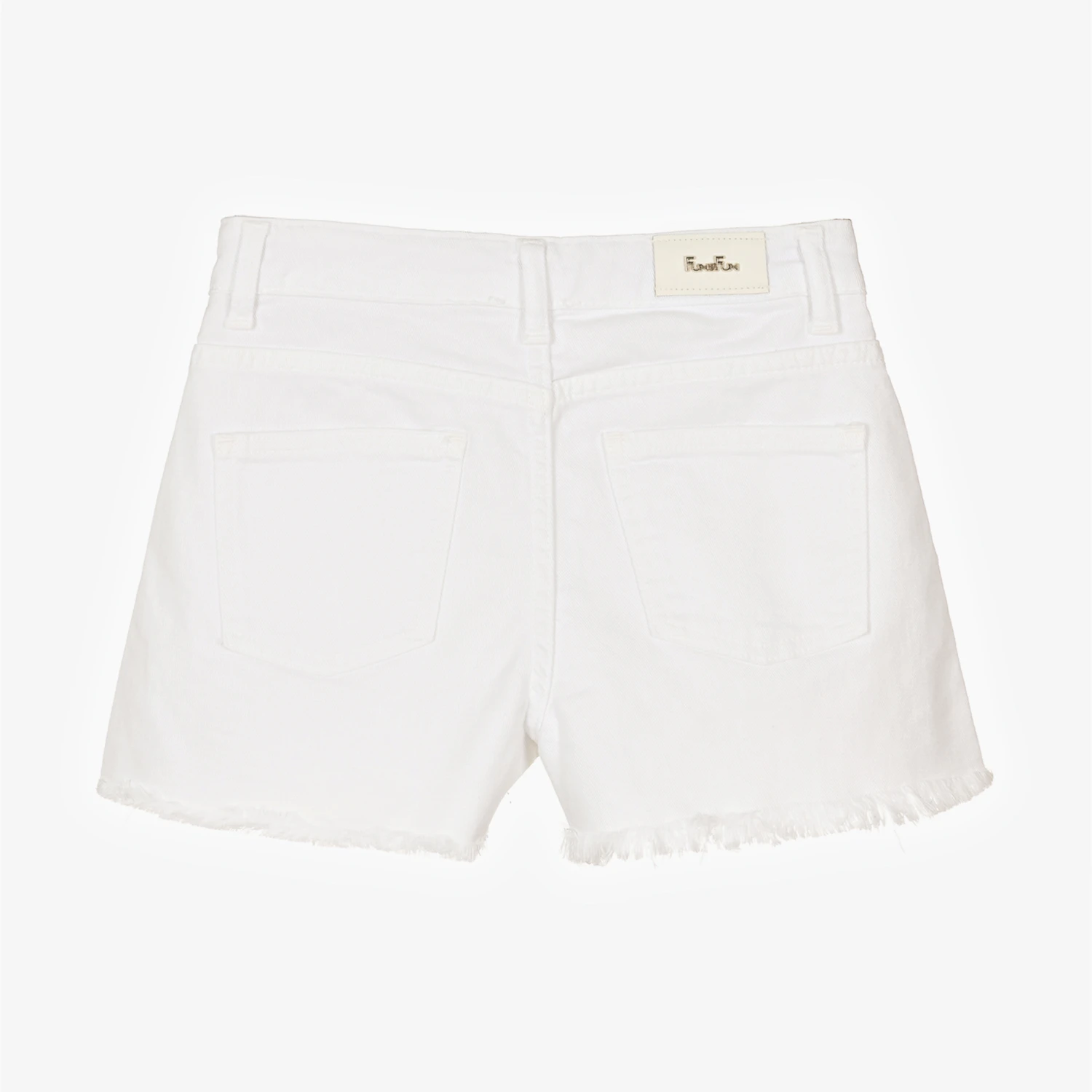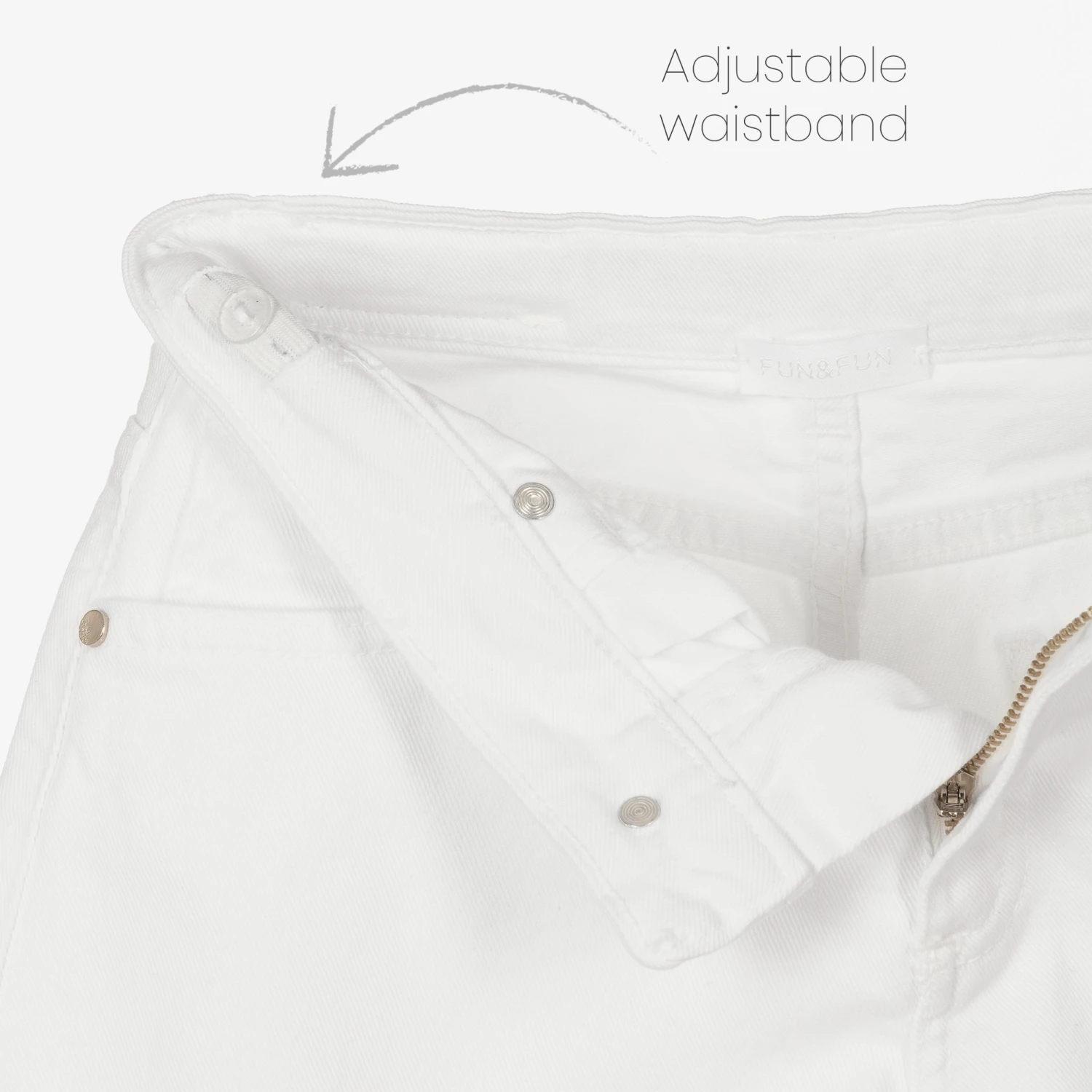 Off white denim shorts for girls by Fun & Fun, made in mid-weight cotton. On-trend and super versatile, they feature front and back pockets and frayed hems for a distressed look. They fasten with a button and zip on the front, and an inner adjustable waist for a good fit. Useful belt loops and a logo patch are sewn onto the waistband for a branded finish.