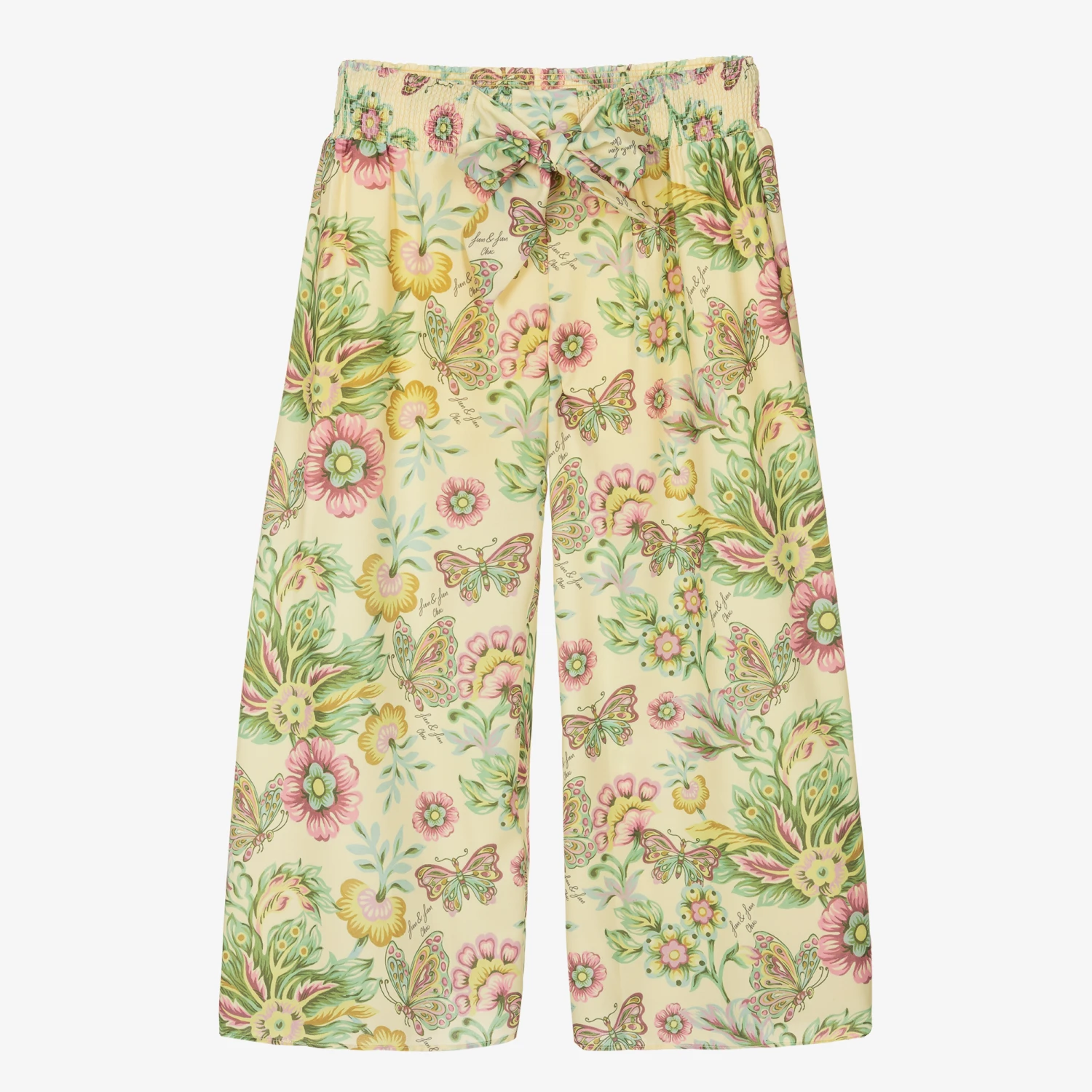 Gorgeous yellow wide leg trousers for girls, by Fun & Fun. Woven in lightweight chiffon, they have a stunning pink and green floral and butterfly print with the brand’s logo incorporated throughout. The elasticated, shirred waistband adds style and comfort to these bottoms, with a tie-up bow in the centre for a feminine touch.