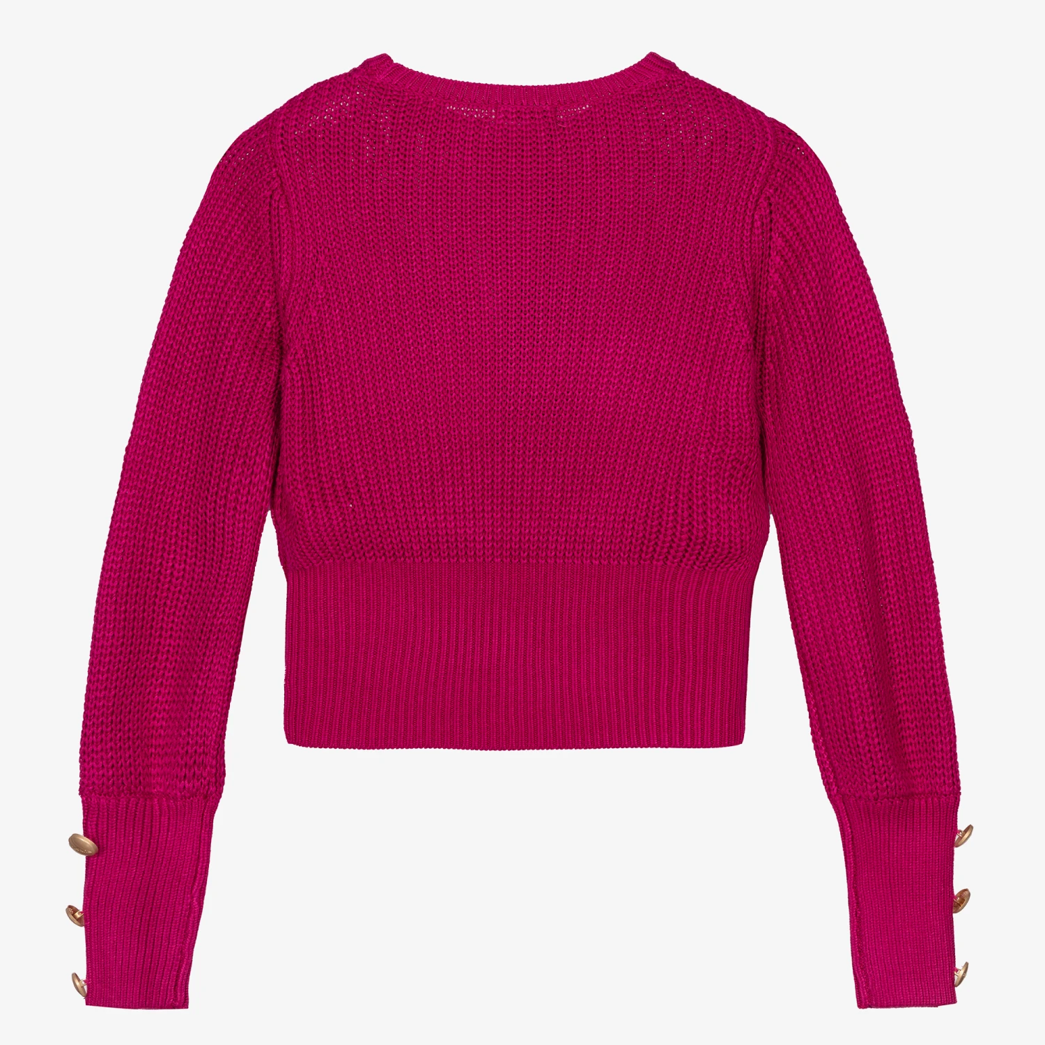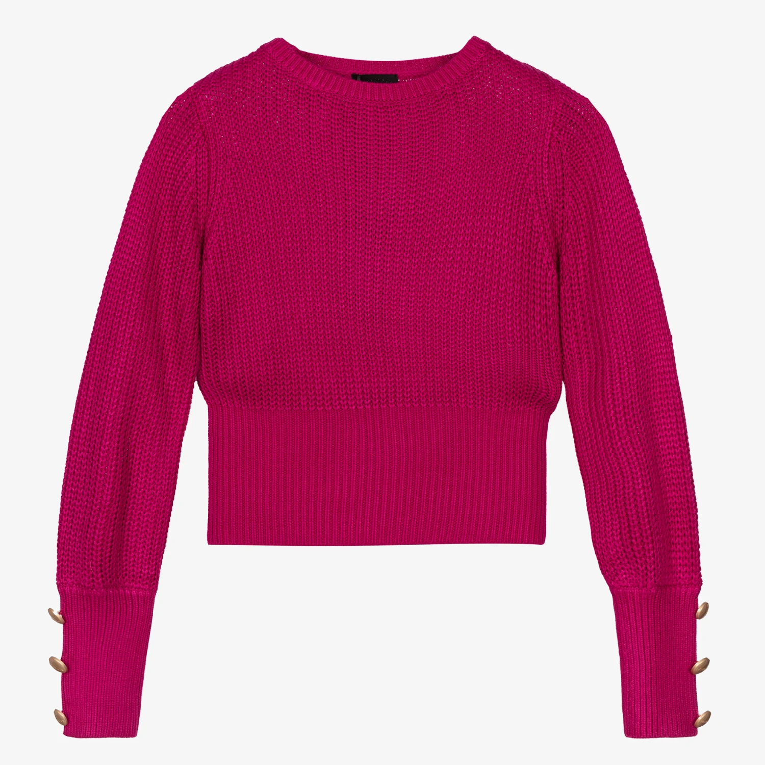 A lovely fuchsia pink sweater for girls by Fun & Fun. It is knitted in soft viscose, with deep ribbing on the cuffs and hem. The cuffs are trimmed with decorative logo-branded buttons.